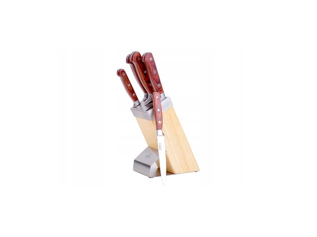 6-dielna kuchynská sada nožov s drevenou rukoväťou a moderným blokom na bezpečné uloženie je skvelou voľbou pre každú domácnosť. Nože sú vyrobené z kvalitnej nehrdzavejúcej ocele s nepriľnavým povrchom pre jednoduché krájanie bez zbytočného lepenia potravín. Ich ergonomická rukoväť z dreva zabezpečuje pohodlie pri každom použití. Všetky nože majú vlastné miesto v bloku, čo zvyšuje bezpečnosť a predlžuje životnosť ostria.