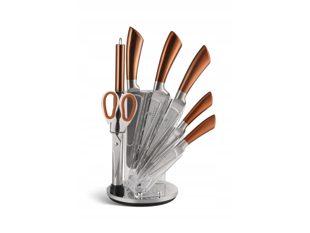 8-dielna sada kuchynských nožov so sekáčikom a nožnicami je všestrannou výbavou pre každodenné varenie. Všetky nože sú vyrobené z uhlíkovej ocele, ktorá zaručuje dlhú životnosť a precízne krájanie. Ergonomické rukoväte zabezpečia bezpečný a pohodlný úchop. Všetko je uložené v otočnom akrylovom stojane, ktorý šetrí miesto a dodá kuchyni moderný vzhľad.