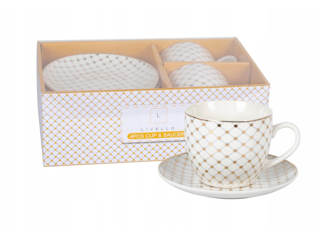 Porcelánová darčeková sada šálok a tanierikov – zlatá geometria