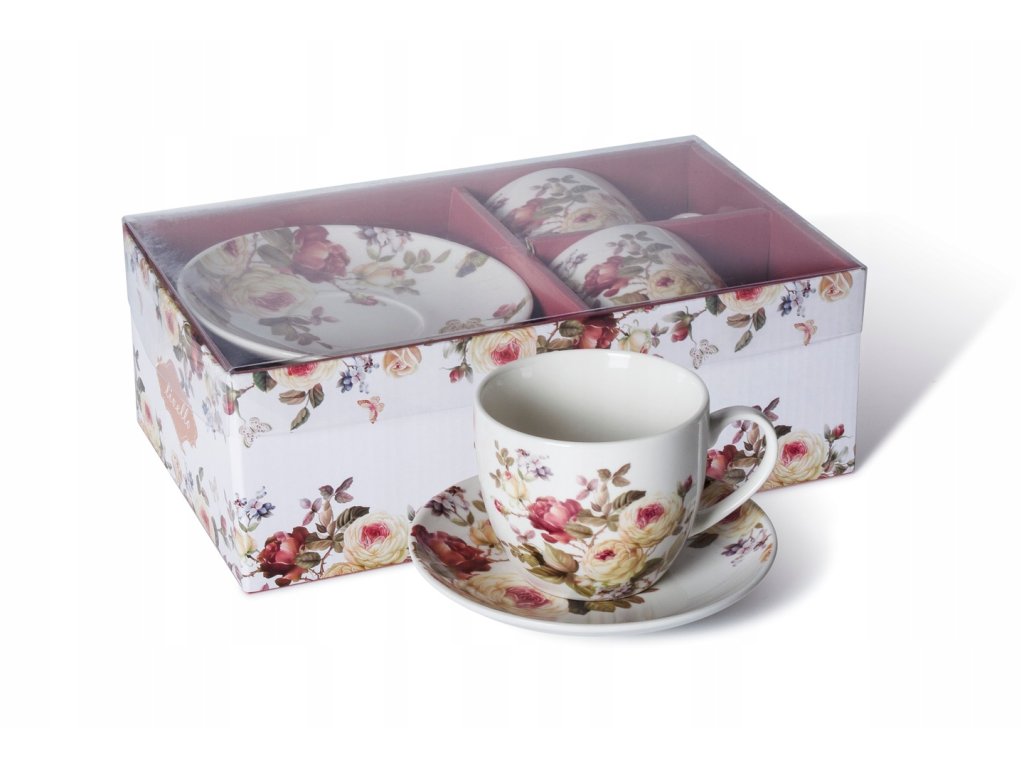 Darčeková porcelánová sada na kávu – romantické ruže, 2 šálky a tanieriky