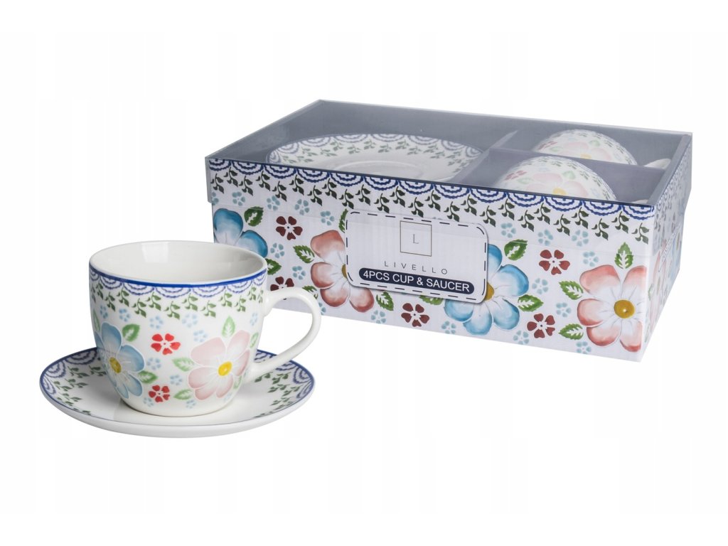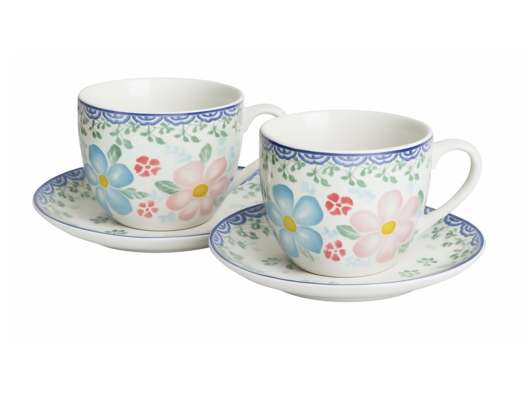 Porcelánová sada šálok s tanierikmi – folklórny kvetinový vzor v pastelových farbách