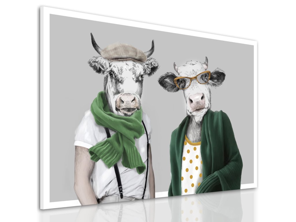 Tento vtipný obraz zobrazuje kravy v ľudskej podobe ako moderný pár – on s baretkou, traky a zeleným šálom, ona v bodkovanej blúzke s výraznými okuliarmi a štýlovým kardigánom. Grafika pôsobí sviežo a hravo, no zároveň elegantne, takže sa hodí do obývačky, pracovne aj štýlovej kaviarne.