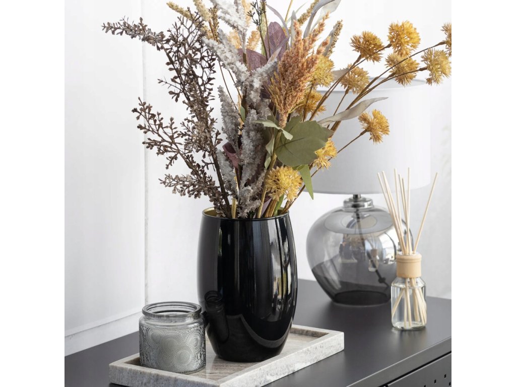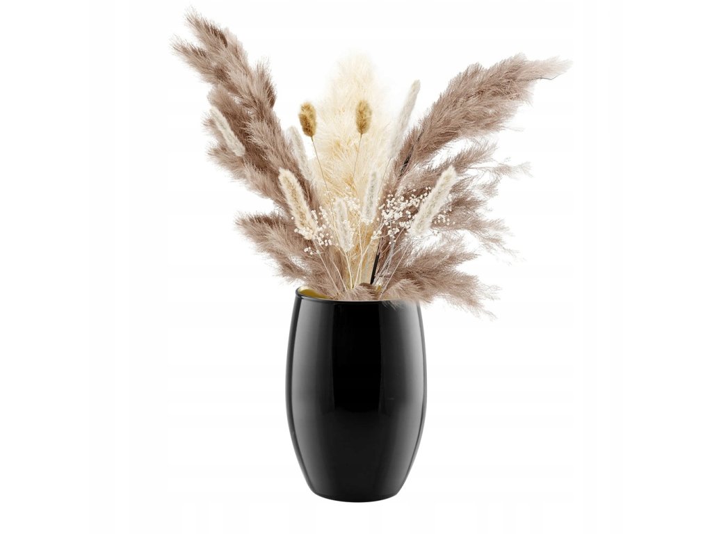 Luxusná sklenená váza so štíhlym, elegantným tvarom je ideálna na stredne veľké kytice alebo aranžmány z pampovej trávy či sušených rastlín. Z vonkajšej strany má hladký čierny povrch s vysokým leskom, zatiaľ čo vnútorná strana žiari zlatou metalickou úpravou. Váza pôsobí mimoriadne noblesne a dodá priestoru prvok luxusu a štýlu. Vyrobená z kvalitného bezolovnatého skla, ktoré je 100 % recyklovateľné.