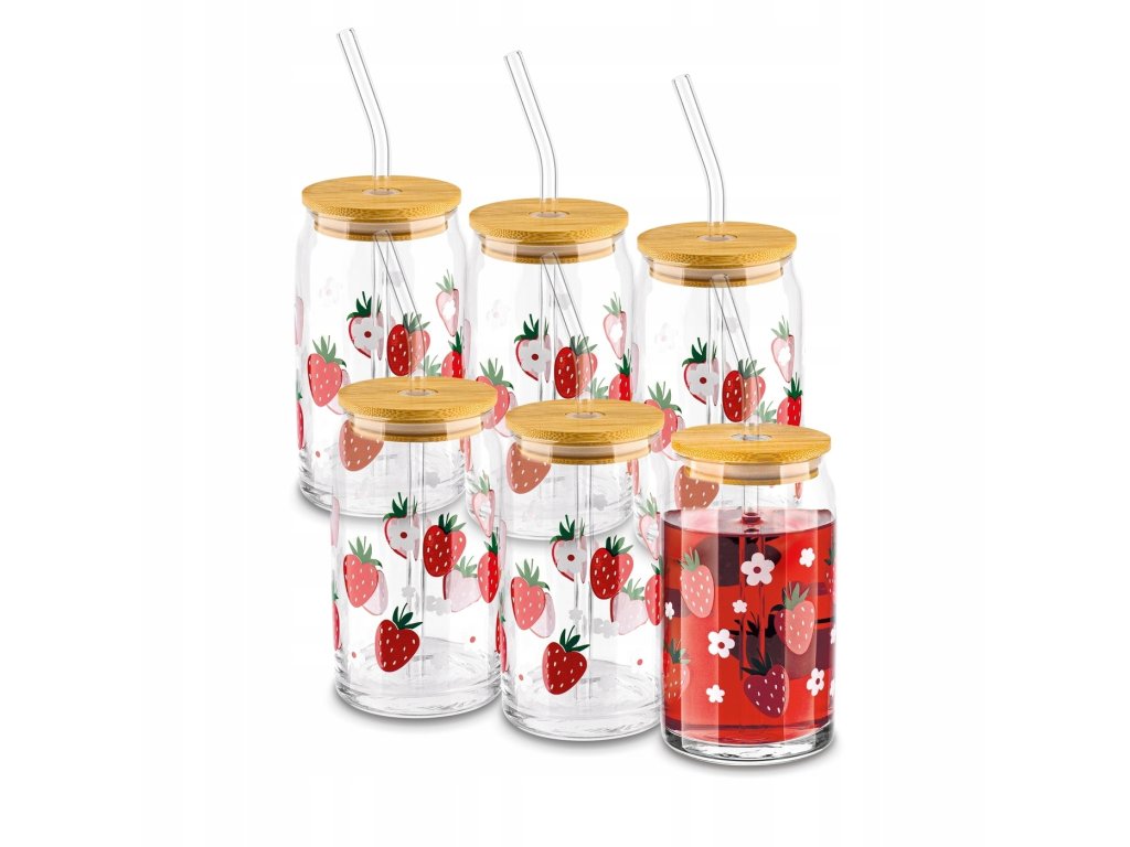 Sklenené poháre s viečkom a slamkou – Sada 6 ks s ovocným motívom 450 ml
