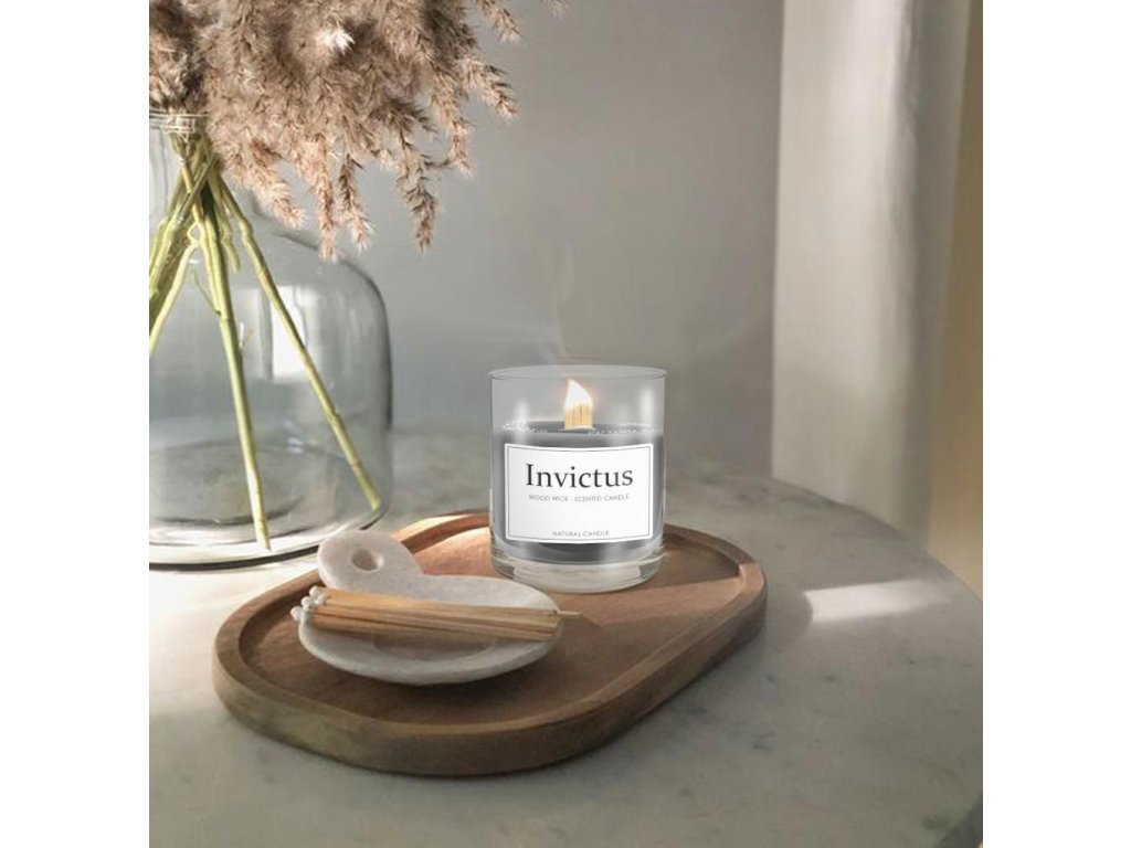 Invictus je štýlová vonná sviečka z kolekcie Moller SPA, ktorá vyniká drevitou a osviežujúcou vôňou s maskulínnym nádychom. Prvé tóny tvoria morské akordy a grapefruitová kôra, ktoré postupne prechádzajú do aromatického laurelu a zakončujú sa v hĺbke guajakového dreva, pačuli a ambry. Drevený knôt pri horení jemne praská, čím vytvára uvoľňujúcu atmosféru. Sviečka je vyrobená zo 100 % sójového vosku bez škodlivín a vydrží horieť až 75 hodín. Ideálny darček pre mužov aj milovníkov sofistikovaných vôní.
