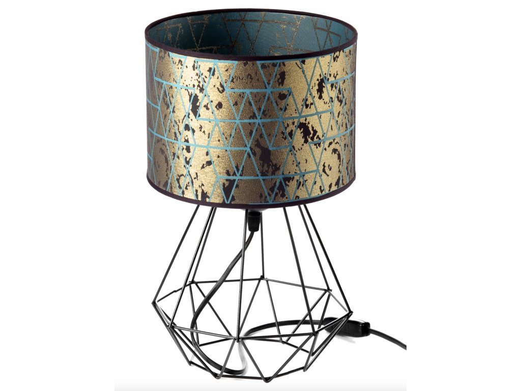 Štýlová stolová lampa zo série Mystic Gold vyniká tyrkysovo-zlatým tienidlom s geometrickým motívom a jemným leskom. Vnútorná reflexná vrstva podčiarkuje zlaté odlesky, vďaka čomu lampa vytvára útulnú, dekoratívnu atmosféru v spálni, pracovni aj v obývačke.