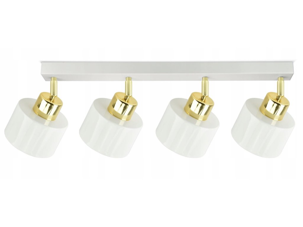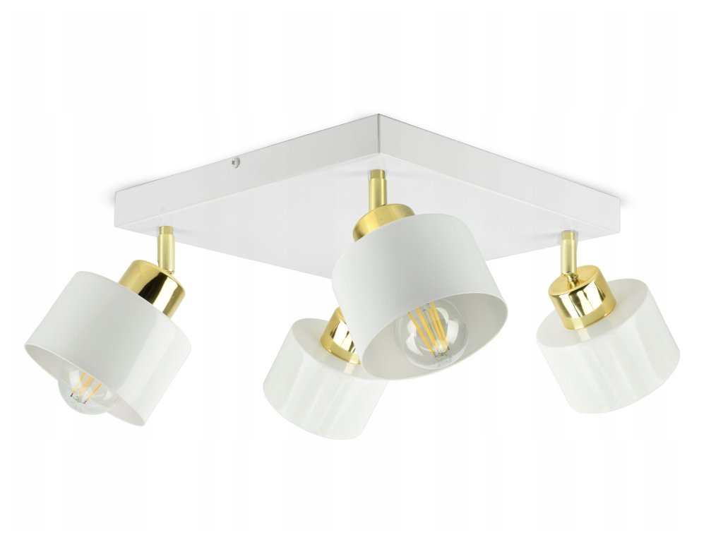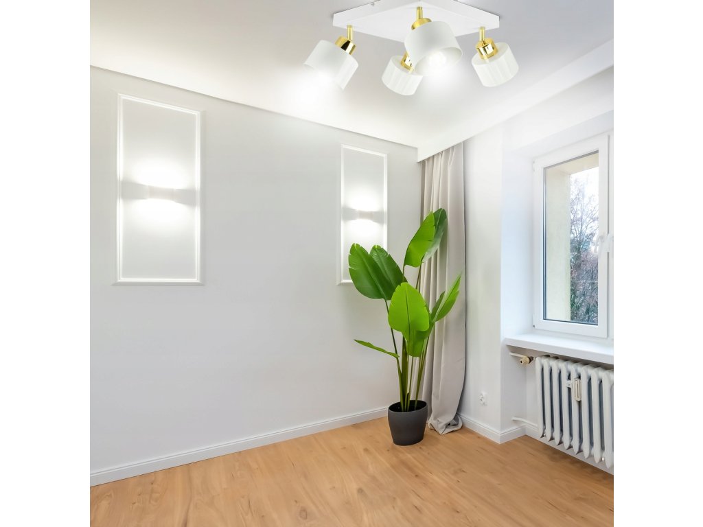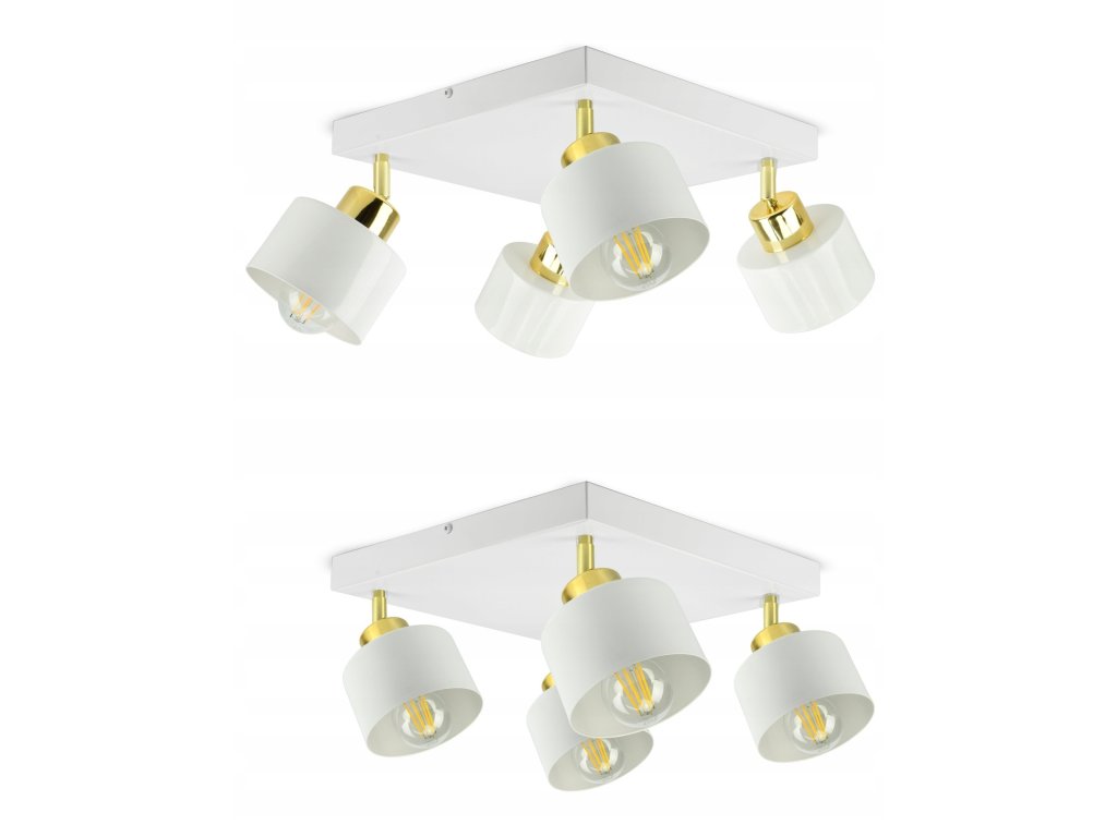 Štýlové stropné svietidlo zo série White Gold spája čistú bielu s lesklými zlatými detailmi. Štyri kovové tienidlá v tvare valca poskytujú dostatok svetla a vďaka nastaviteľným kĺbom si jednoducho nasmerujete lúč tam, kde ho potrebujete – nad jedálenský stôl, pracovnú zónu či do obývačky.