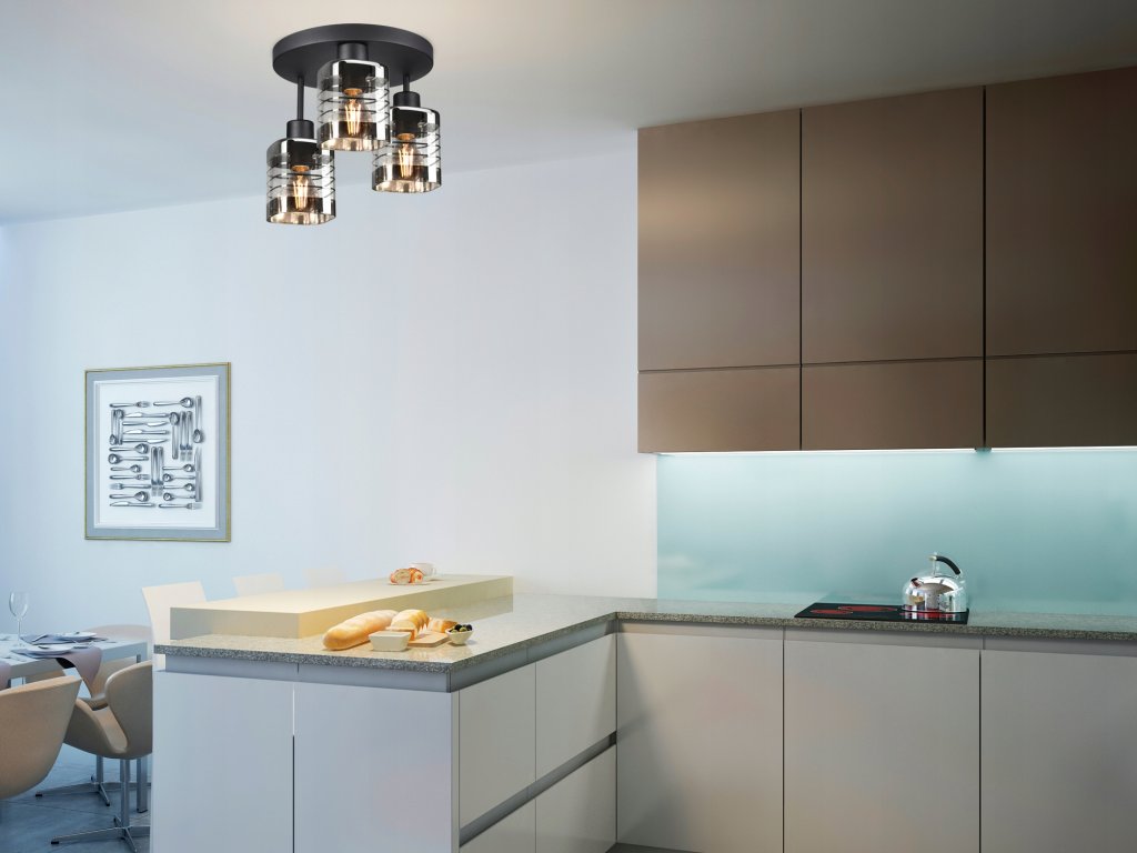 Elegantné stropné svietidlo zo série Silver Stripe ponúka tri svetelné body v tvare hranatých sklenených tienidiel s jemnými striebornými pásmi. V kombinácii s čiernou matnou konštrukciou pôsobí luxusne, no zároveň decentne – ideálne pre moderné, minimalistické aj loftové interiéry.
