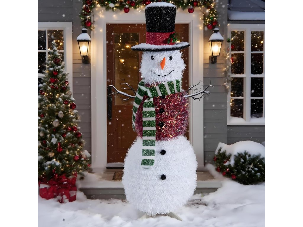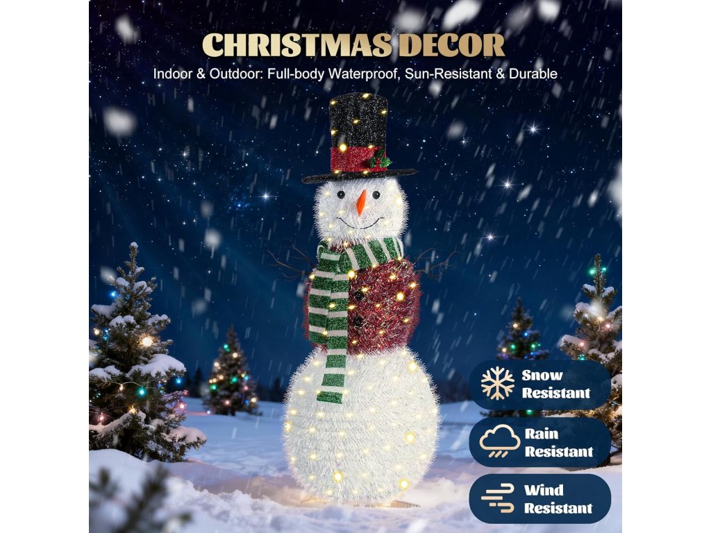 Tento očarujúci LED snehuliak s výškou 120 cm je nádherným doplnkom vianočnej výzdoby doma aj vonku. Vďaka 150 teplým LED svetlám vytvára jemné zlaté osvetlenie, ktoré prežiari záhradu, terasu aj predsieň. Snehuliak je navrhnutý tak, aby pôsobil elegantne – má čierny klobúk, zelený šál a decentný lesk vďaka trblietavej PET textílii s jemným odrazom svetla.