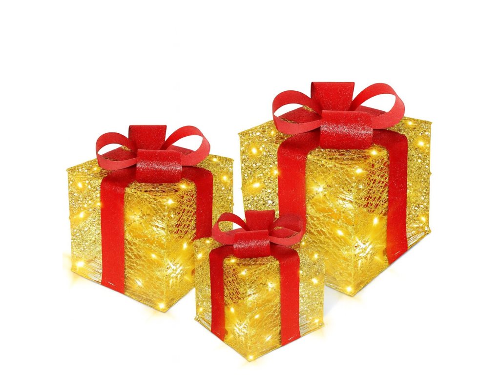 LED darčekové boxy so zlatým efektom – sada 3 svetelných dekorácií s červenou mašľou a 60 teplými LED (interiér)