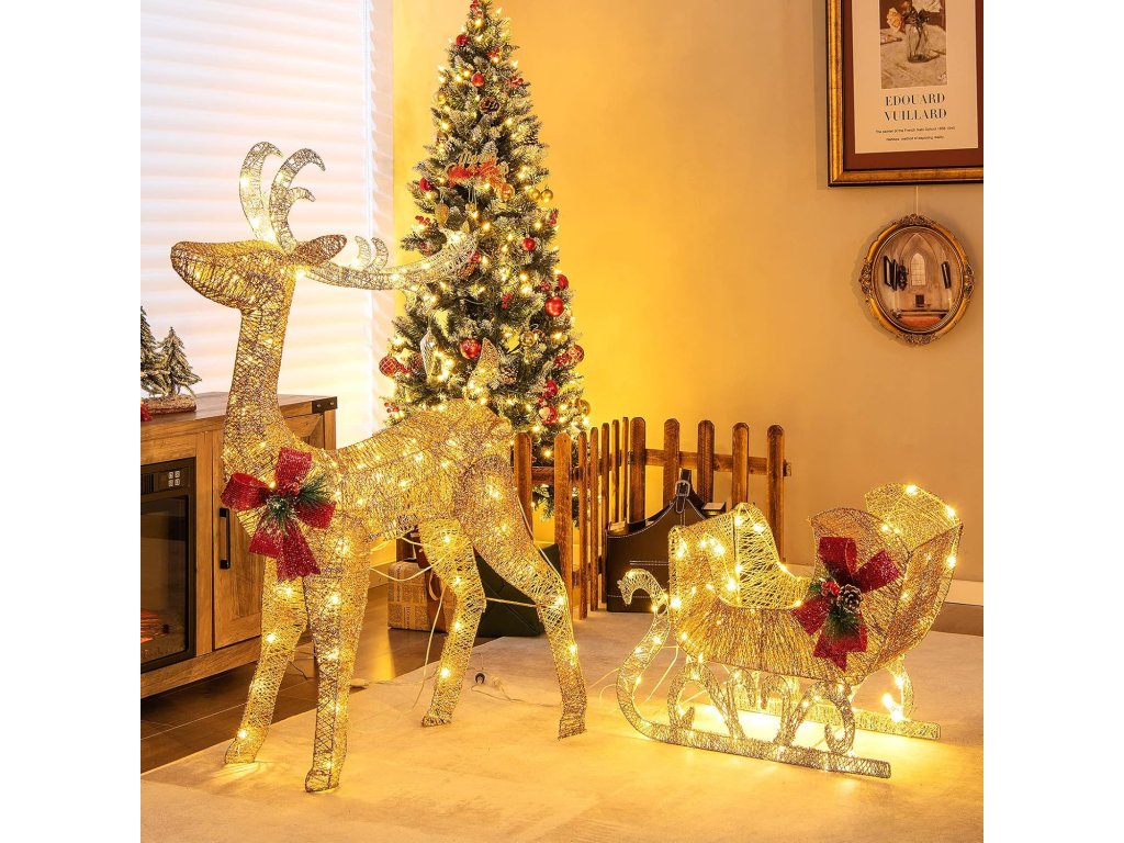 Svetelná dekorácia sob s parohami a vianočné sane LED prinesie do vášho domova neopakovateľnú sviatočnú atmosféru. Zlatistý povrch, červené mašle a ozdobené šiškami, bobuľami a ihličím vytvoria tradičný vianočný vzhľad, ktorý poteší deti aj dospelých.