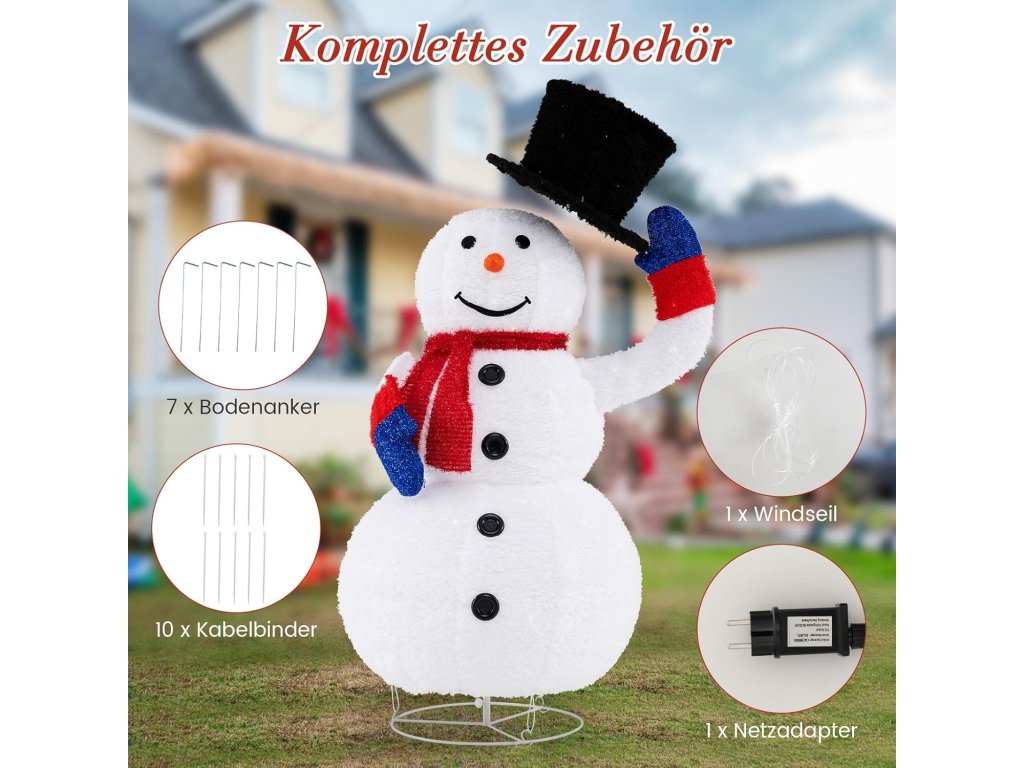 Snehuliak je vyrobený z odolného all-weather materiálu, ktorý je vodotesný, vetruodolný aj mrazuvzdorný, takže spoľahlivo vydrží celé zimné obdobie. Súčasťou je aj pohyblivý klobúk, ktorý jemne kýva hore-dole a dodáva dekorácii jedinečný charakter. Vďaka priloženým kolíkom, páskám a kotviacemu systému ho ľahko upevníte v záhrade, na terase či pri vchode do domu.