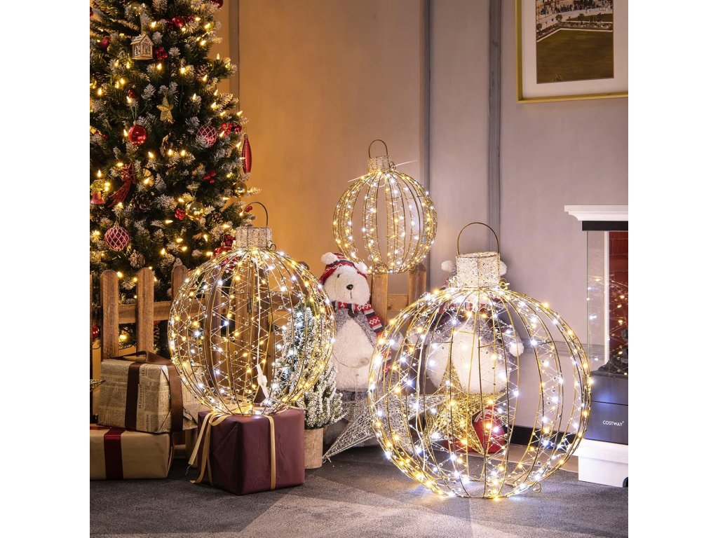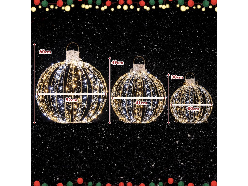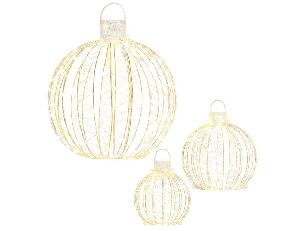Táto sada obsahuje tri svietiace vianočné gule LED rôznych veľkostí (60 cm, 49 cm a 38 cm), ktoré krásne doplnia vašu výzdobu. Každá guľa je vyrobená z pevného kovového rámu so zlatým povrchom a ozdobená perlovými svetelnými šnúrami, ktoré vytvárajú jedinečný efekt.