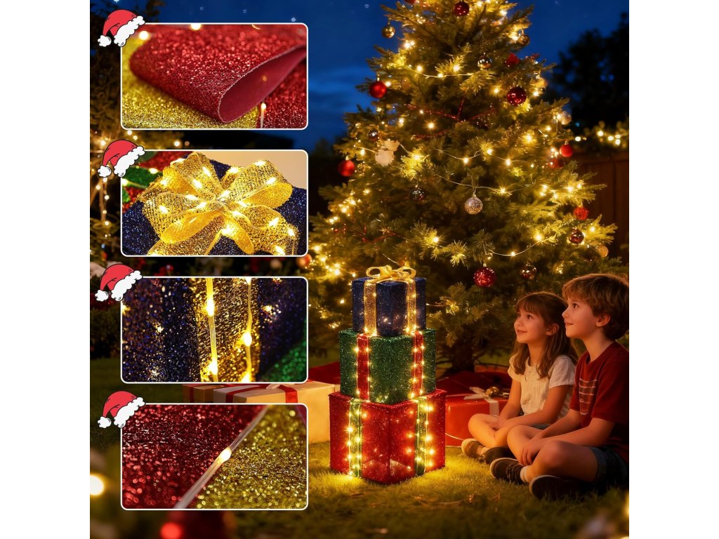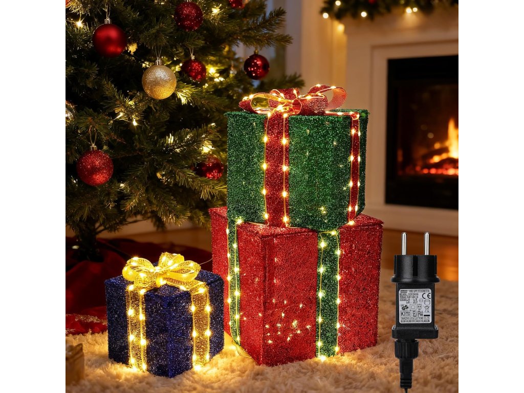 LED darčekové boxy – súprava 3 trblietavých vianočných dekorácií so 160 teplými LED svetlami (interiér/exteriér)