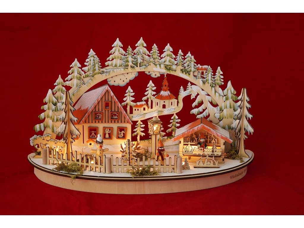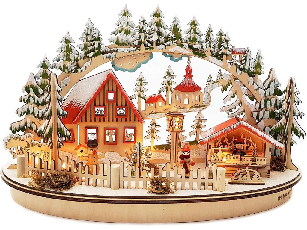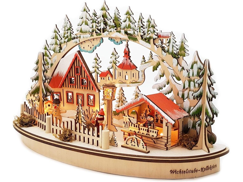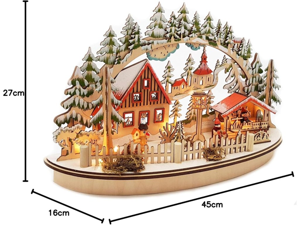Dedinka je vybavená úsporným LED osvetlením, ktoré rozžiari každý detail a navodí hrejivú atmosféru. Vďaka automatickému časovaču sa sama rozsvieti každý deň v rovnakom čase, takže si sviatočné svetlo užijete bez starostí. Tento kúsok je vyrobený značkou Wichtelstube Kollektion – symbolom nemeckej kvality a tradičného dreveného umenia.