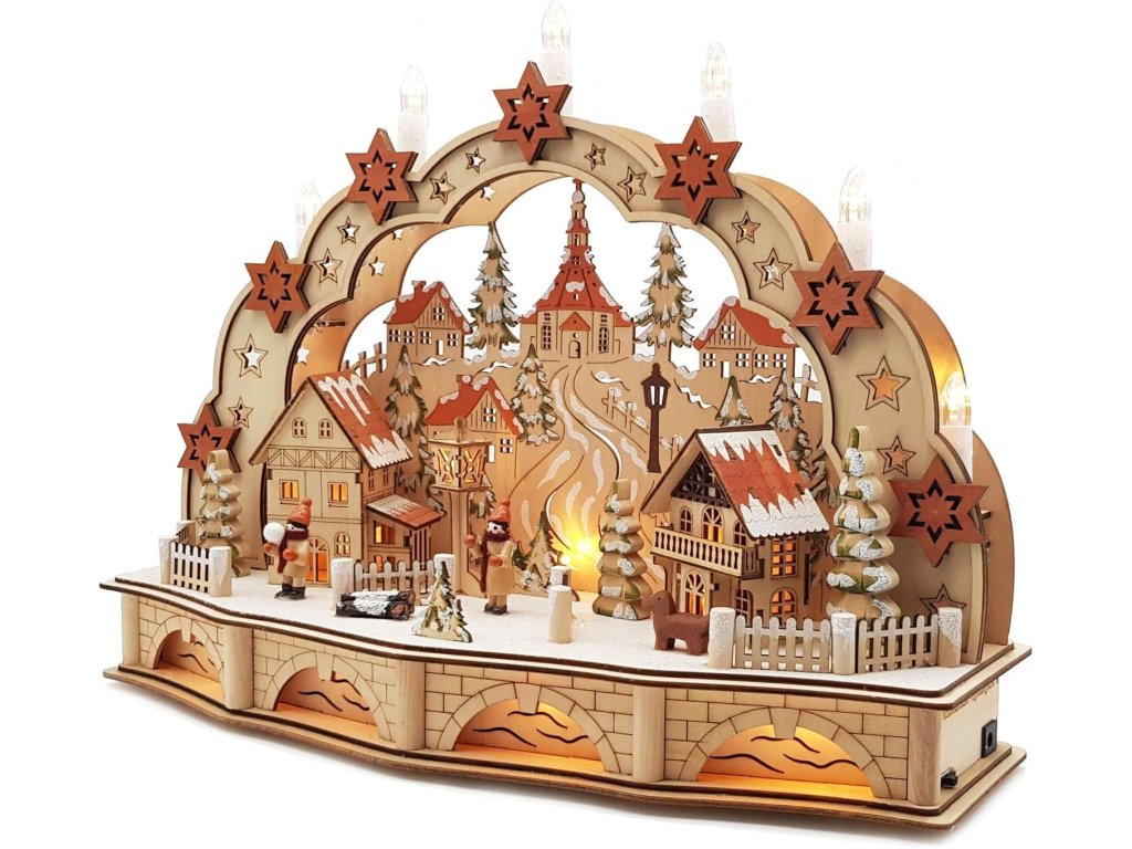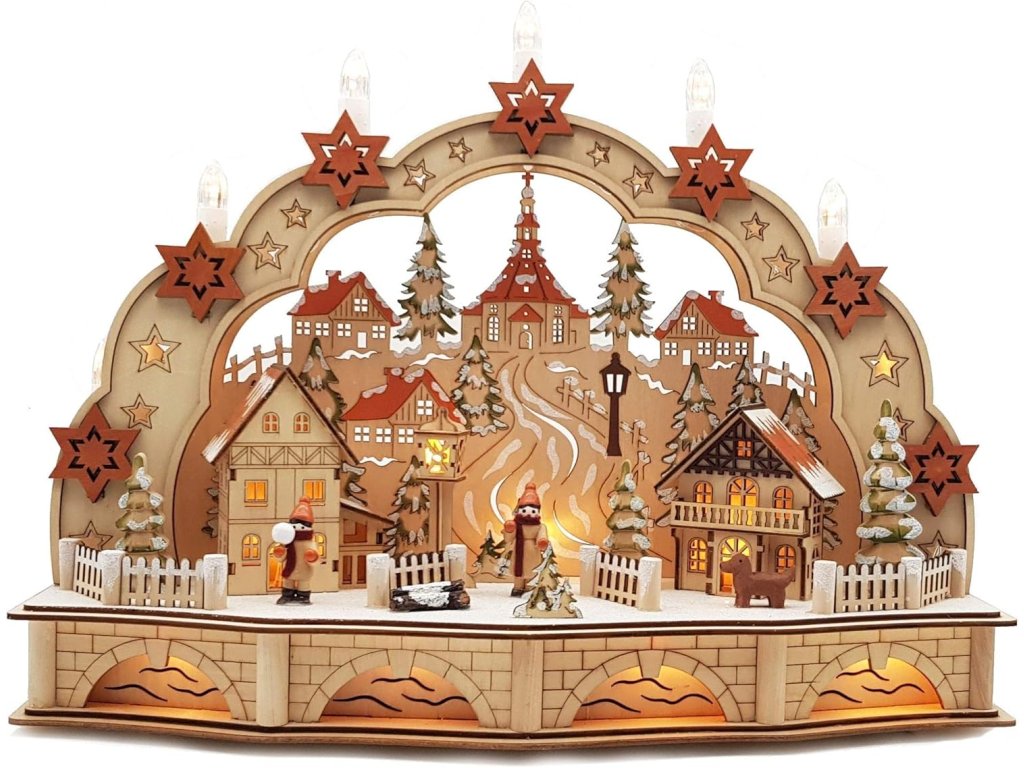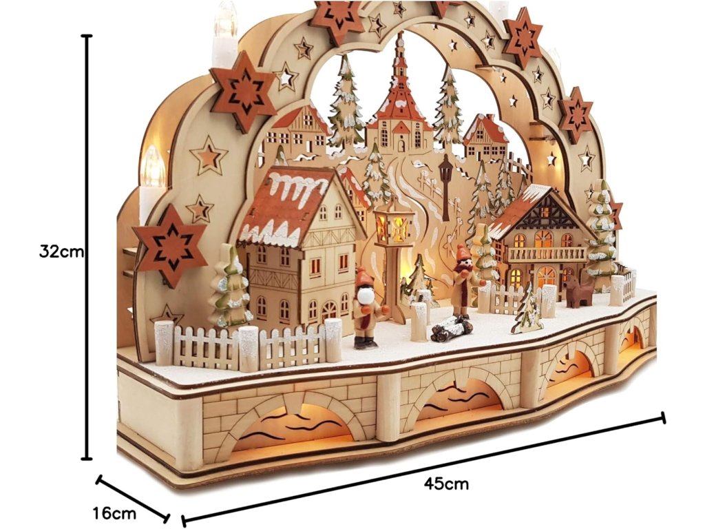 Detailne vyrezávané domčeky, postavičky a majestátny Seiffenský kostol vytvárajú dojem autentickej zimnej scenérie. Integrované LED osvetlenie v teplom tóne dodáva dekorácii hrejivý lesk a vďaka automatickému časovaču sa rozžiari každý deň v rovnakom čase. Ide o kvalitný produkt značky Wichtelstube Kollektion, známej svojou nemeckou precíznosťou a dlhou tradíciou výroby vianočných dekorácií.