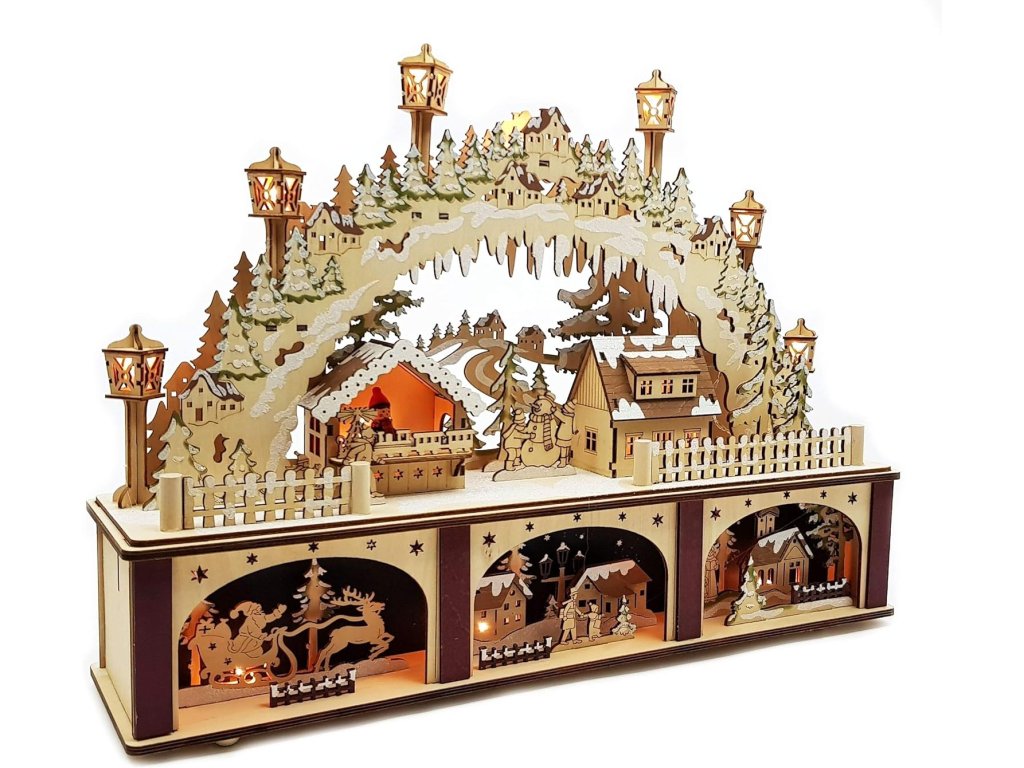 Drevená LED vianočná dedinka – ručne spracovaná zimná dedinka v Krušných horách s oblúkovým osvetlením