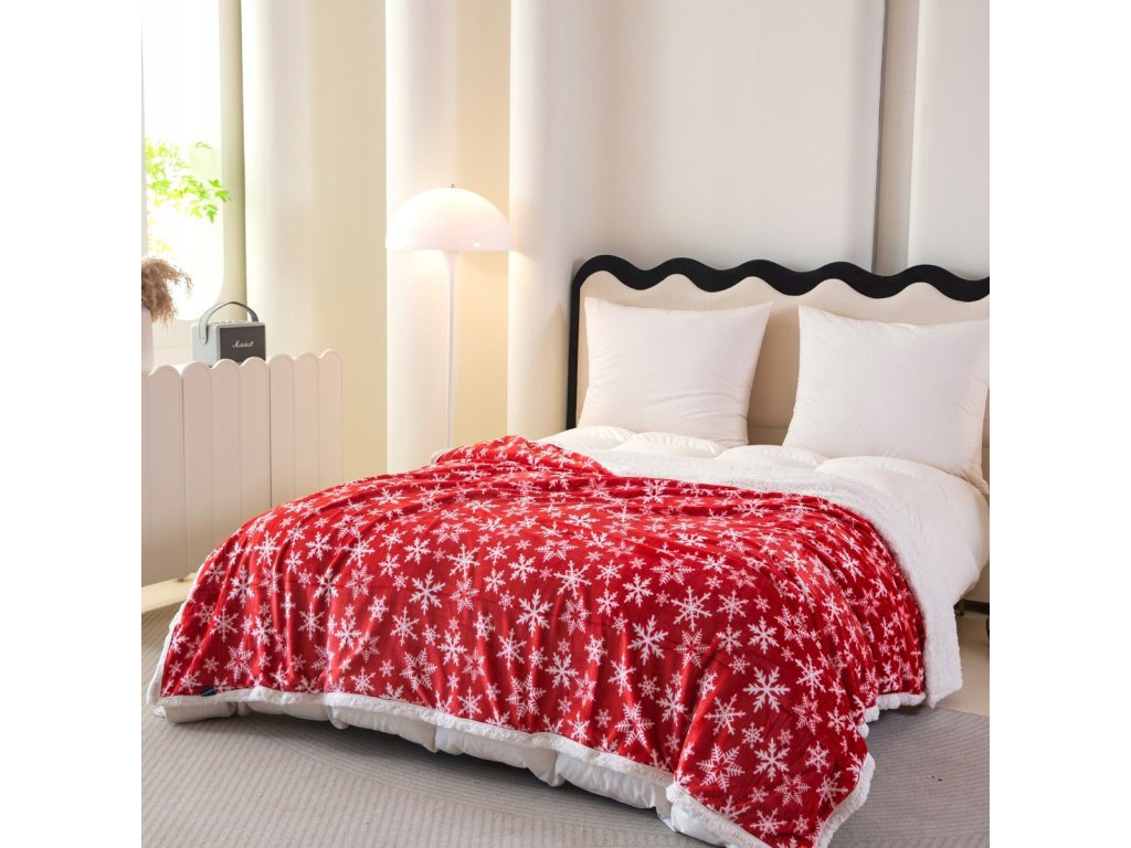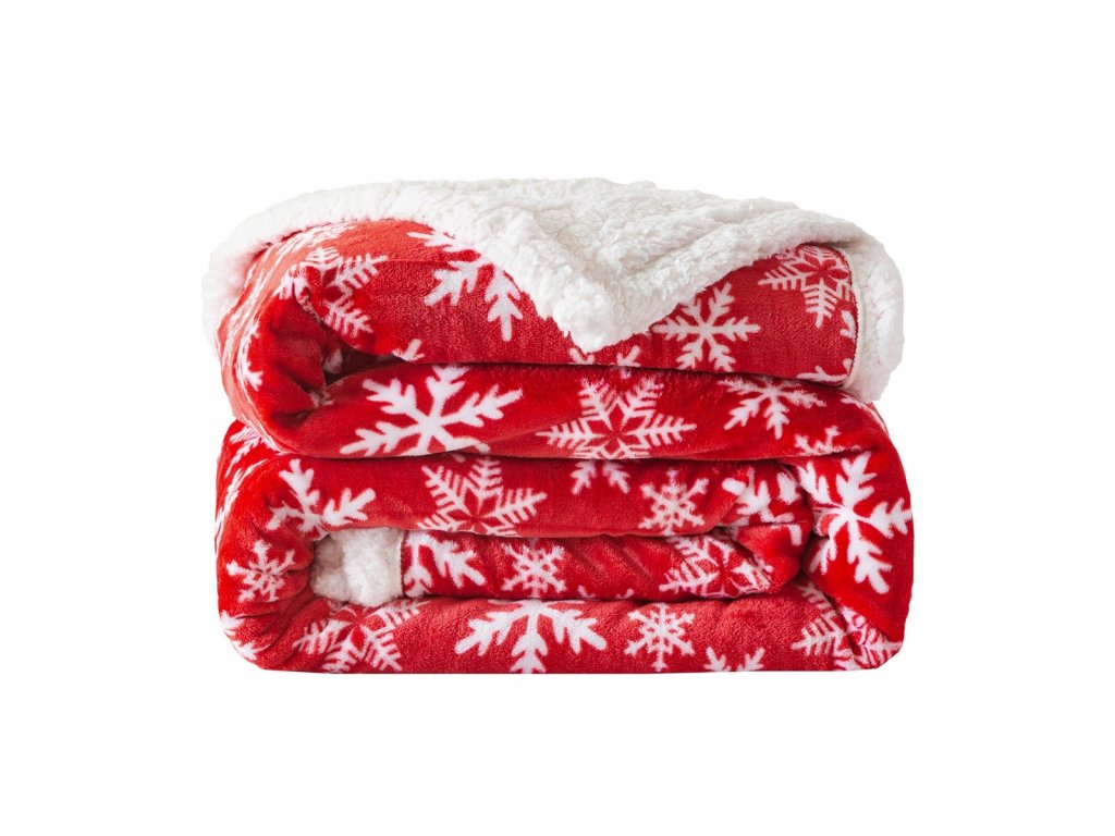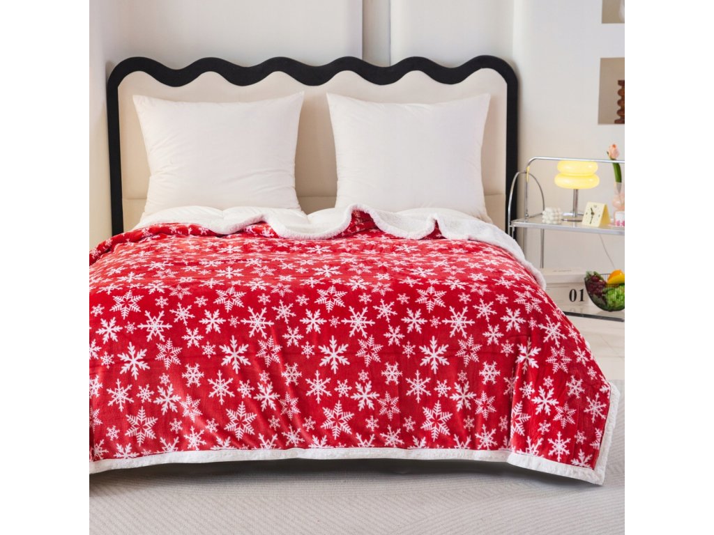 Vianočná červená obojstranná deka s barančekom a vločkami – mäkká hrejivá prikrývka na zimu