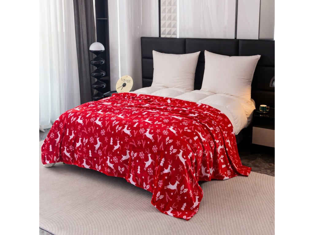 Táto vianočná červená deka s motívom sobov, vločiek a vetvičiek je dokonalým symbolom sviatočného obdobia. Mäkký materiál je príjemný na dotyk, hrejivý a hebký, takže sa do nej budete radi zabaliť počas zimných večerov.