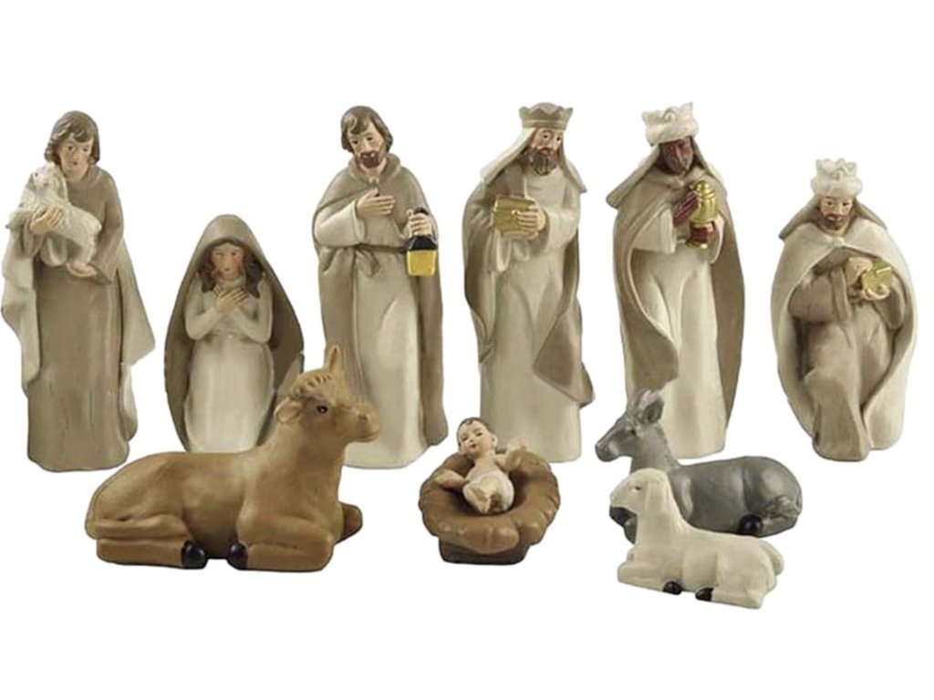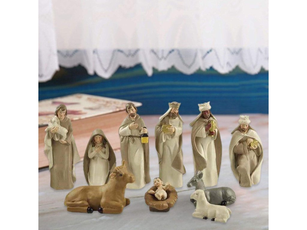 Tento elegantný betlehem s 12 figúrkami zobrazuje pôvabnú scénu narodenia Ježiška – Svätej rodiny, troch mudrcov, pastiera a zvieratiek. Každá postava je vyrobená z kvalitnej živice a ručne maľovaná jemnými odtieňmi béžovej, hnedej a zlatej, vďaka čomu pôsobí prirodzene a pokojne.