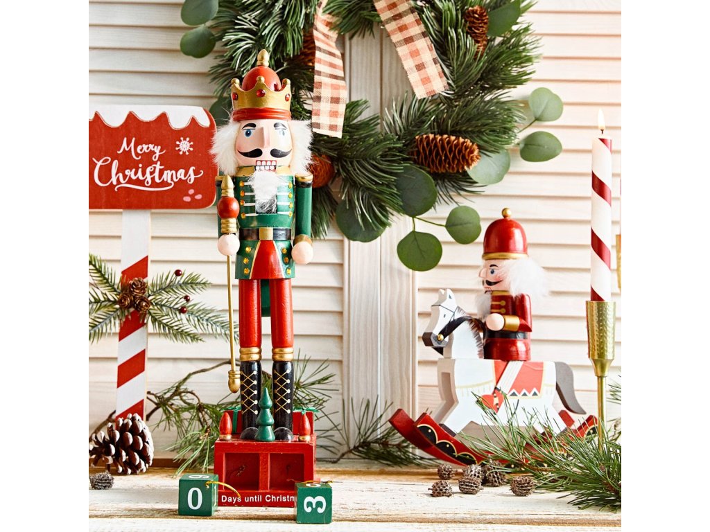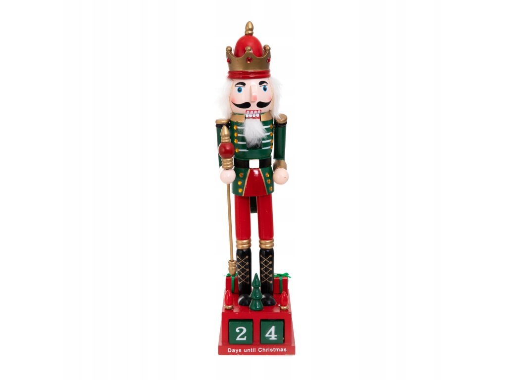 Vianočný luskáčik s adventným kalendárom – drevená figúrka v červeno-zelenej farbe, 42 cm