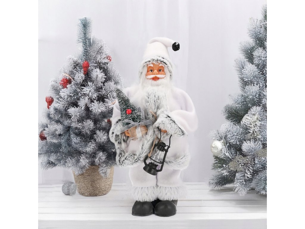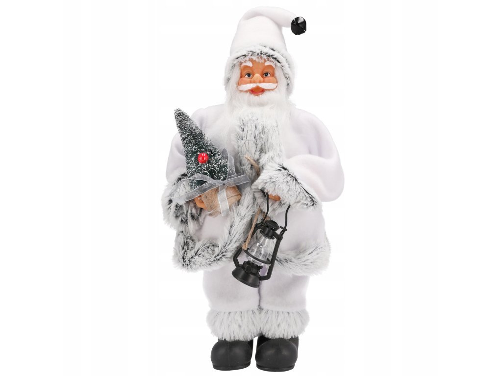 Vianočný Mikuláš v bielom kabáte – zimná dekorácia so stromčekom a lampášom, 30 cm