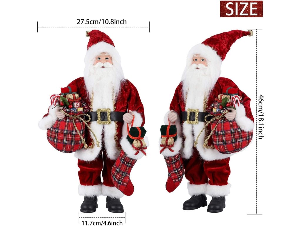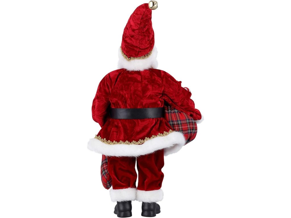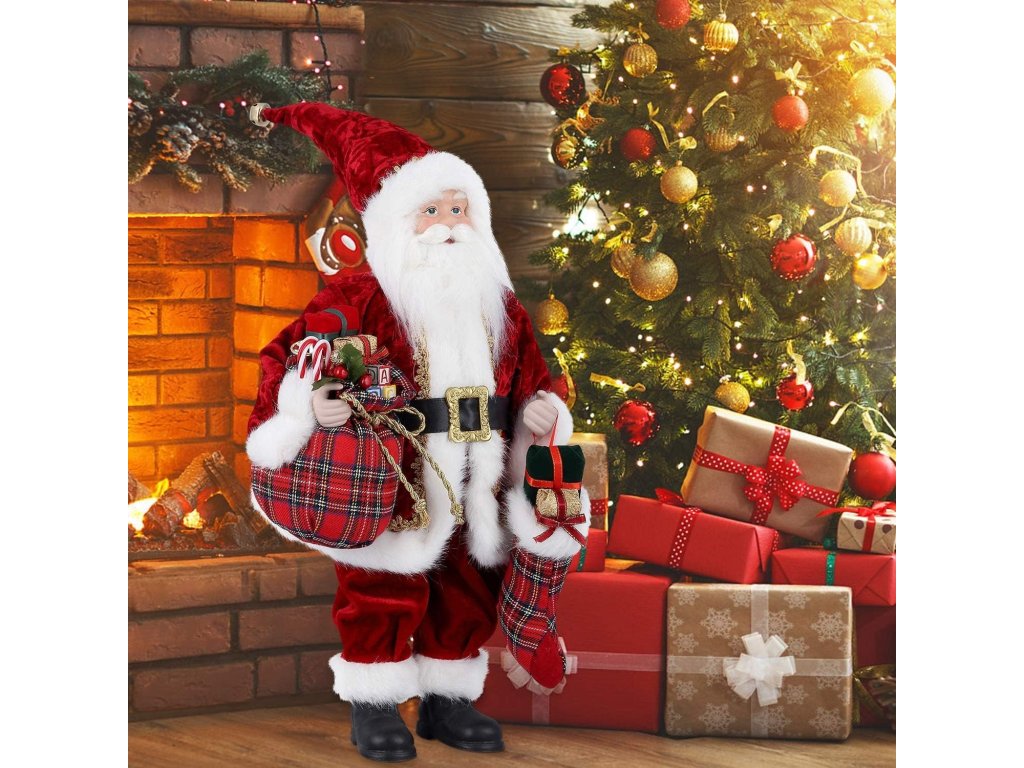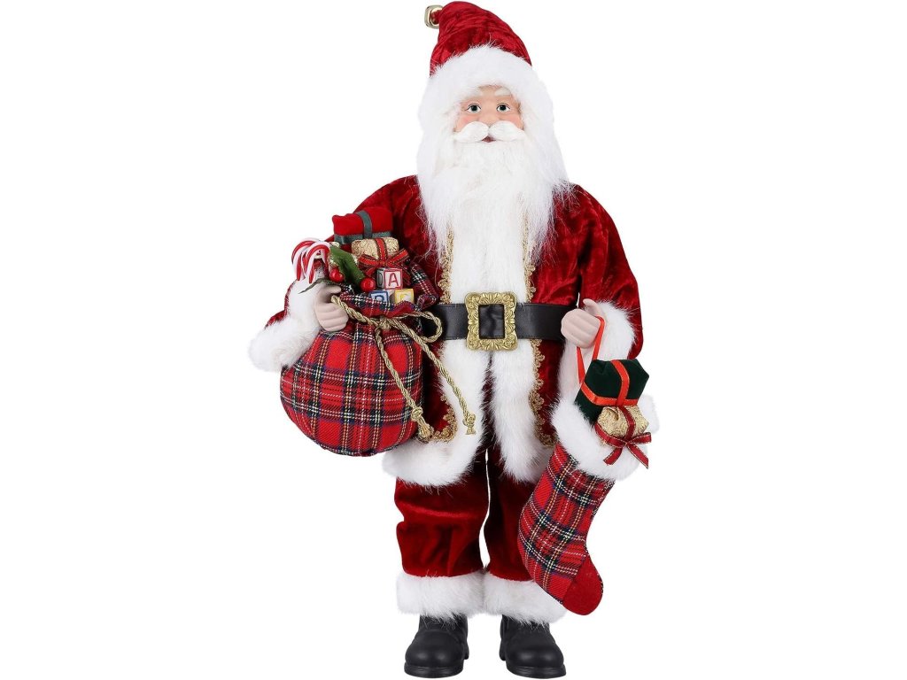 Doprajte svojmu domovu dotyk tradície s týmto vianočným Mikulášom v červenom kabáte, ktorý vyzerá, akoby práve prišiel z rozprávky. V ruke drží kárované vrecko plné darčekov, cukríkov a ozdôb, zatiaľ čo druhou nesie vianočnú pančuchu ozdobenú mašľou a balíčkami.