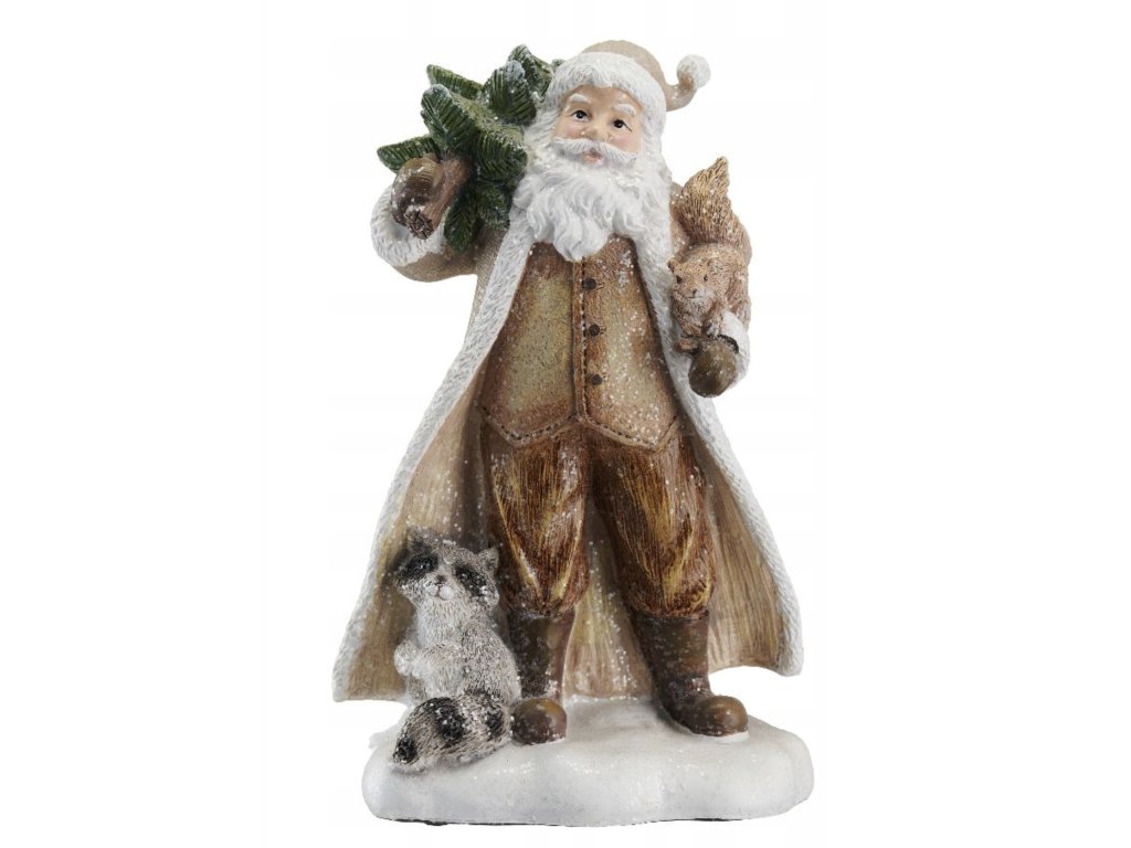 Vytvorte si útulnú vianočnú atmosféru s touto nádhernou figúrkou Mikuláša, ktorá pôsobí ako vystrihnutá z rozprávky. Oblečený do svetlohnedého kabáta so zlatistými detailmi a jemne posypaný trblietkami, nesie na pleci malý stromček a pri nohách mu verne stojí roztomilý mýval.