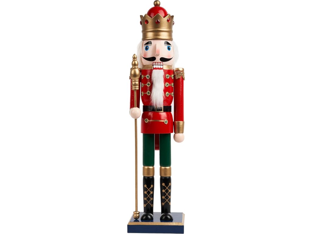 Luskáčik má na sebe červený kabát so zlatými detailmi, zelené nohavice a čierne čižmy. V ruke drží žezlo ako pravý kráľ a jeho zlatá koruna s drahokamami mu dodáva majestátny charakter. Vďaka stabilnej drevenej podstave sa dokonale hodí na krbovú rímsu, komodu či vianočný stôl.