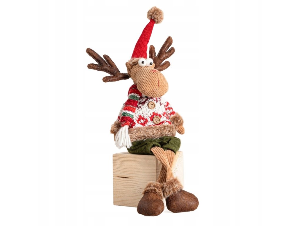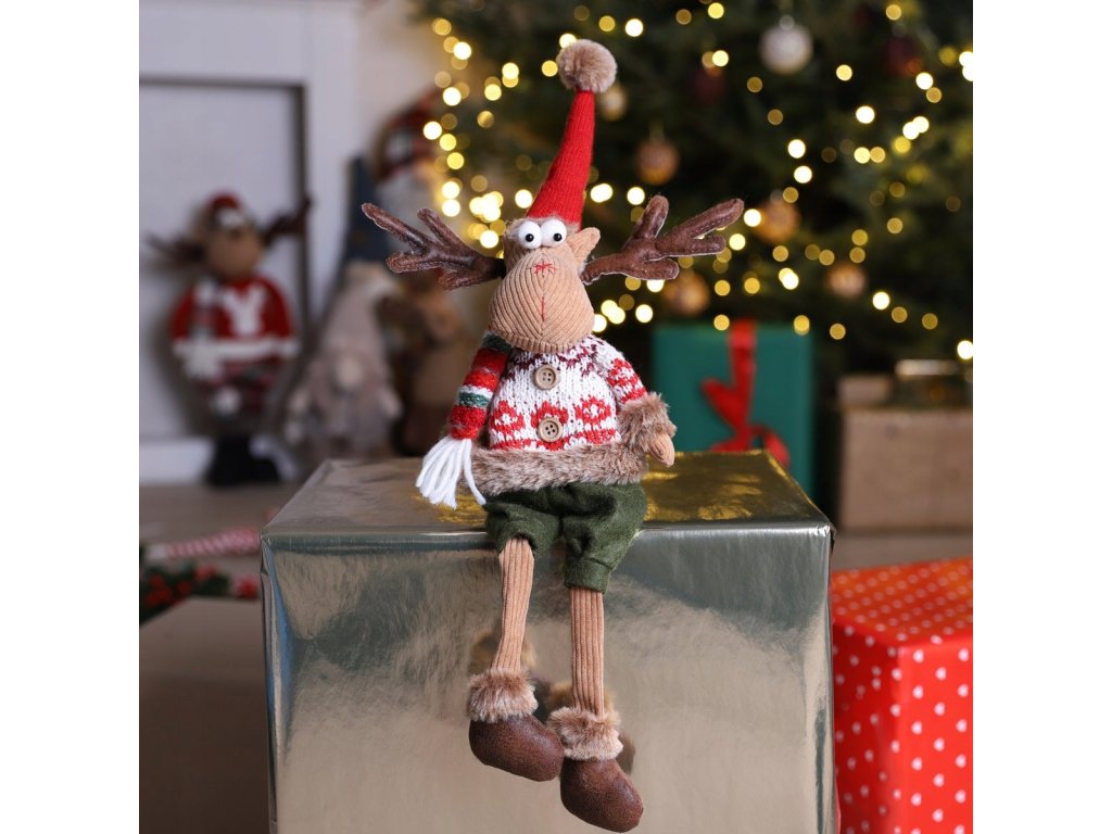 Tento sediaci vianočný sob so svojím milým výrazom a mäkkým svetríkom sa stane obľúbenou súčasťou vašich sviatočných dekorácií. Je oblečený v červenom svetríku s bielo-zeleným vzorom a má na hlave čiapku s brmbolcom, ktorá mu dodáva rozkošný vzhľad. Vďaka svojmu mäkkému telu a ohybným nohám krásne sedí na okraji poličky, komody alebo stola.