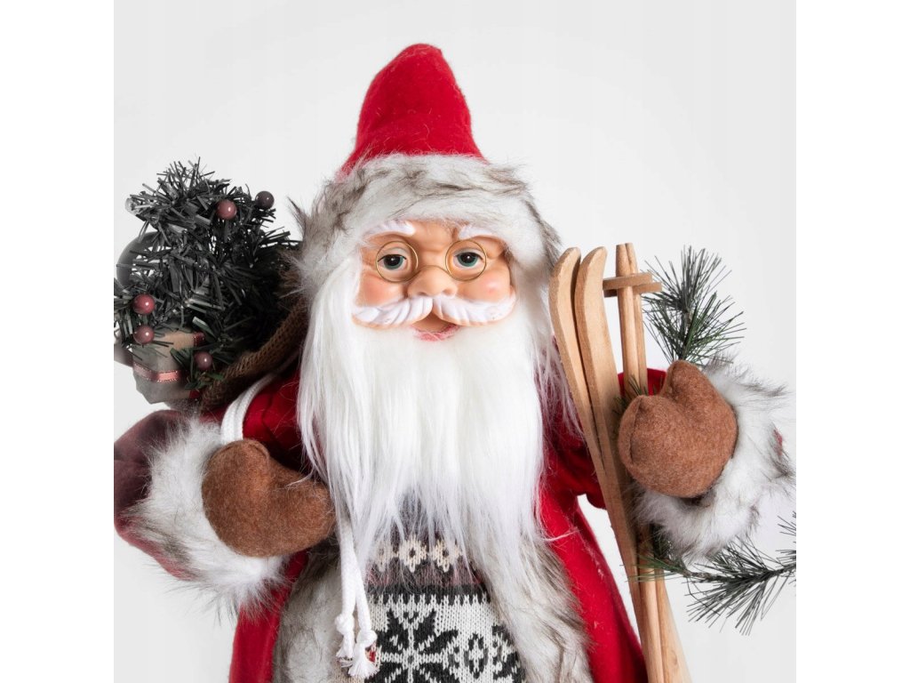 V jednej ruke drží lyže, v druhej vianočný venček s vetvičkami a bobuľkami. Každý detail je starostlivo vypracovaný – od jeho dlhej brady až po kožušinové lemovanie. Vďaka svojmu prírodnému vzhľadu sa hodí do každého priestoru – od obývačky po vstupnú halu.