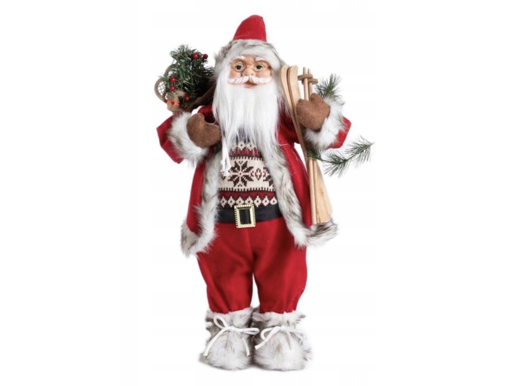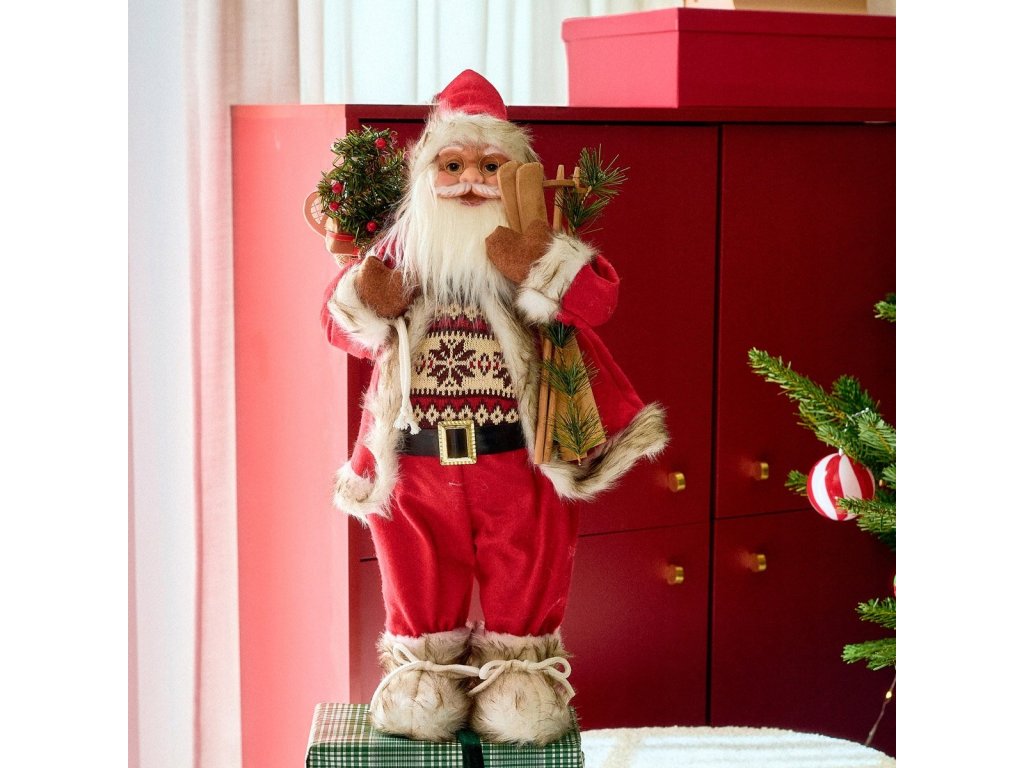 Tento veľký Mikuláš s výškou 60 cm je dokonalou dominantou vašich vianočných dekorácií. Vďaka červenému kabátu, huňatým čižmám a svetríku s nórskym vzorom vnesie do interiéru tradičné zimné čaro a pocit rodinnej pohody.