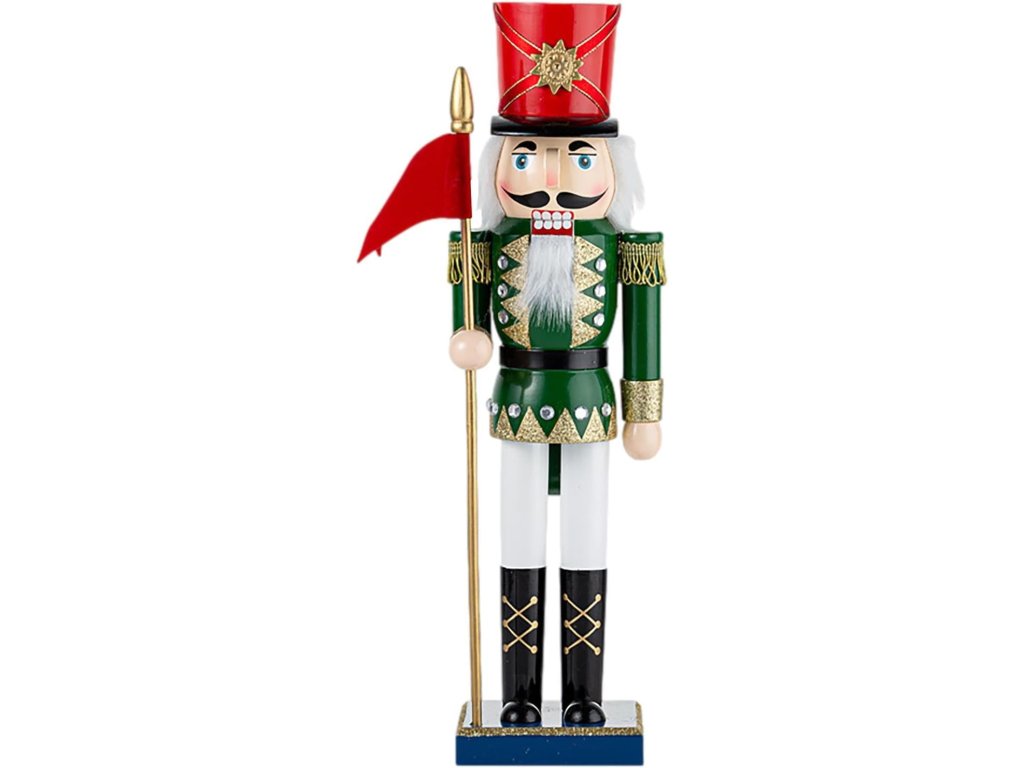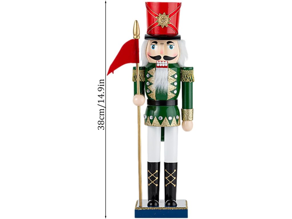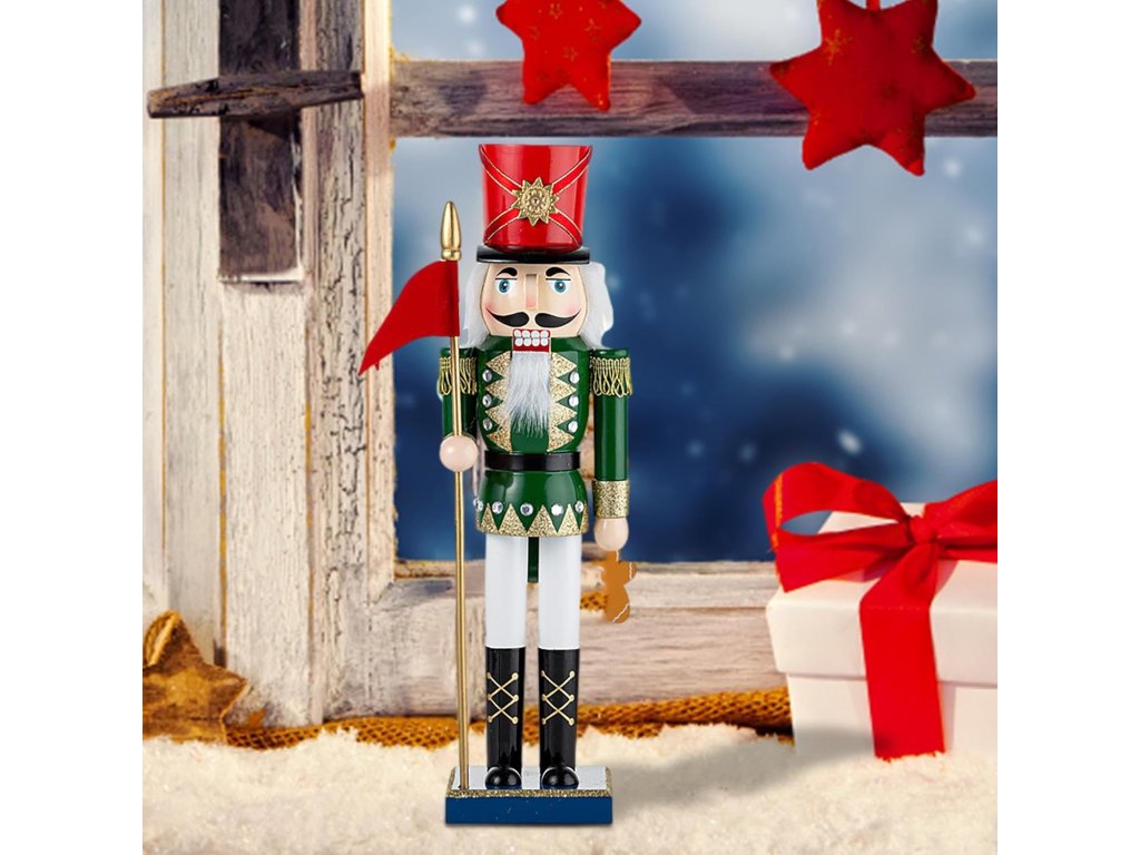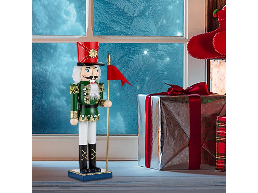 Objavte čaro klasického vianočného luskáčika v podobe vznešeného vojaka so zástavou. Táto ručne maľovaná dekorácia v tradičných farbách zelenej, červenej a zlatej pôsobí elegantne a nostalgicky zároveň.