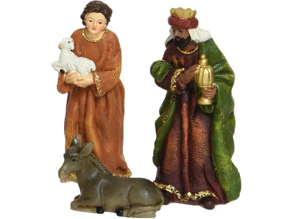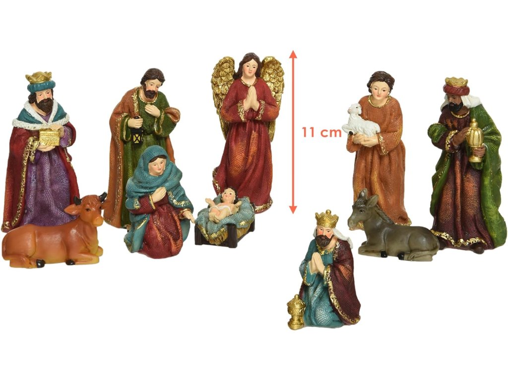 Elegantná súprava 10 figúrok betlehema, ktoré sú ručne maľované v teplých, tradičných farbách. Každá postava (do výšky 11 cm) je precízne prepracovaná – od jemných tvárí až po zlaté detaily šiat – aby vytvorila harmonickú, slávnostnú kompozíciu na poličku, komodu či sviatočný stôl.
