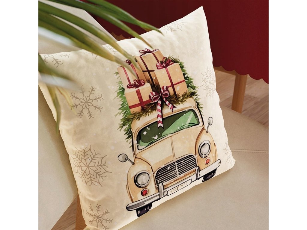 Zamatová obliečka Retro auto s darčekmi je ako malý návrat do minulosti – do čias, keď Vianoce voňali po ihličí, koláčoch a snehu. Na béžovom podklade s jemnými snehovými vločkami je vyobrazené retro auto vezúce stromček a kôpku darčekov previazaných červenými mašľami. Celkový dojem umocňuje akvarelový štýl potlače, ktorý pôsobí teplo a nostalgicky.