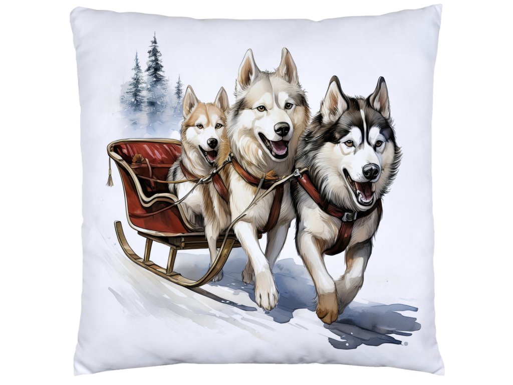 Vianočná obliečka Husky na saniach – zimný motív so psím záprahom 40x40 cm