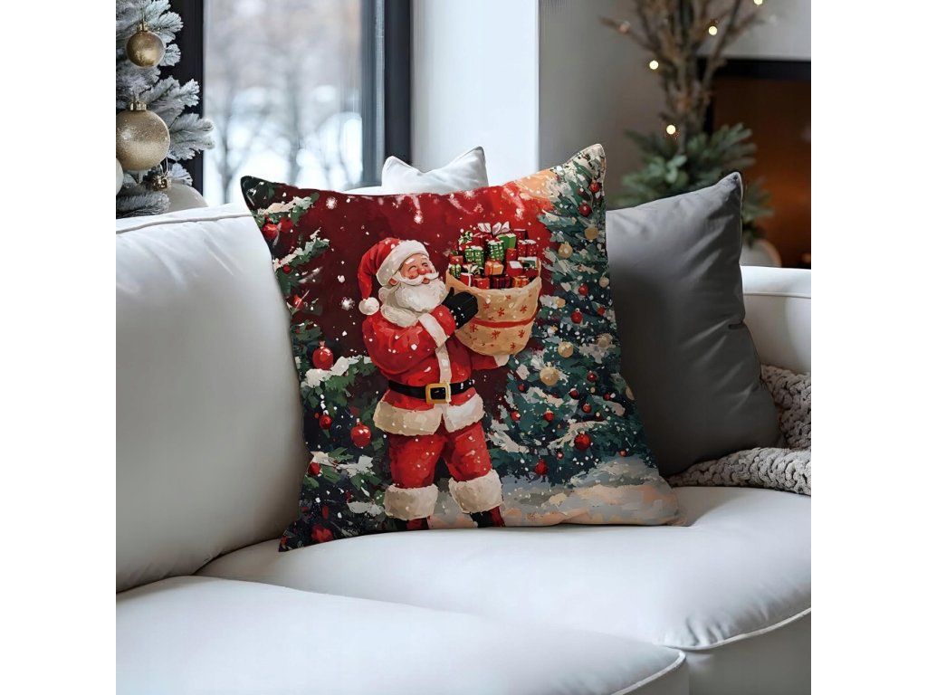 Obliečka Santa Claus prinesie do vášho domova pravú sviatočnú náladu. Motív usmievavého Santu s plným vrecom darčekov a bohato zdobeného stromčeka na červenom pozadí pôsobí teplo, radostne a dokonale doladí vianočné prostredie v každej miestnosti.