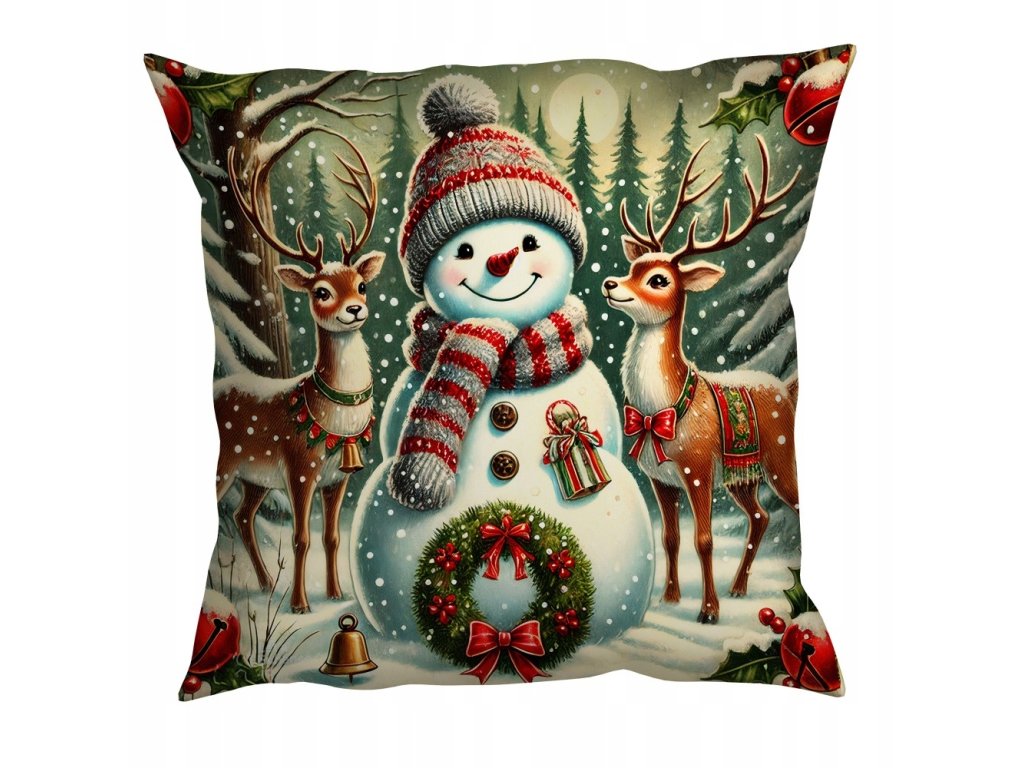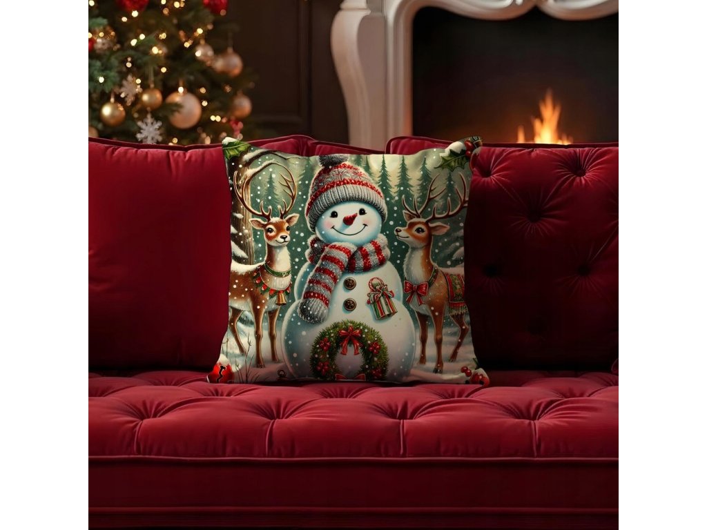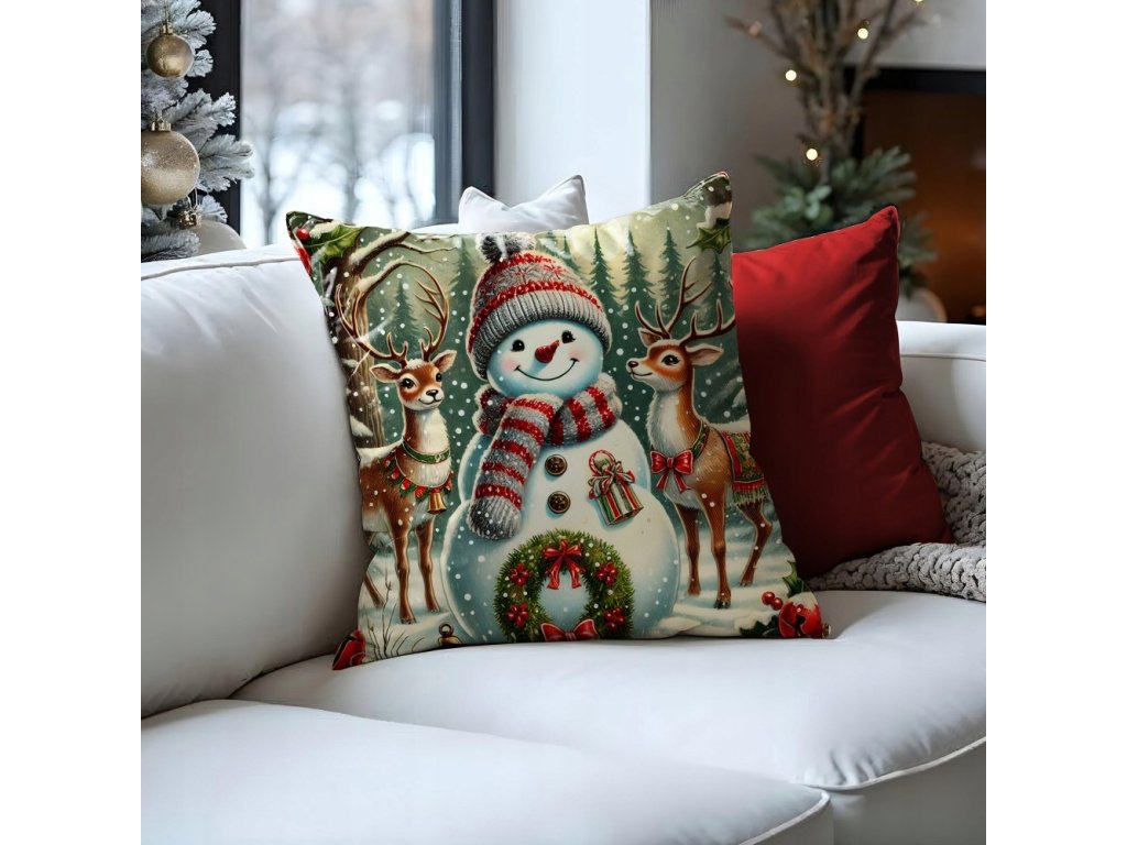 Vianočná obliečka Snehuliak a soby – zimný motív s červenými detailmi 40x40 cm