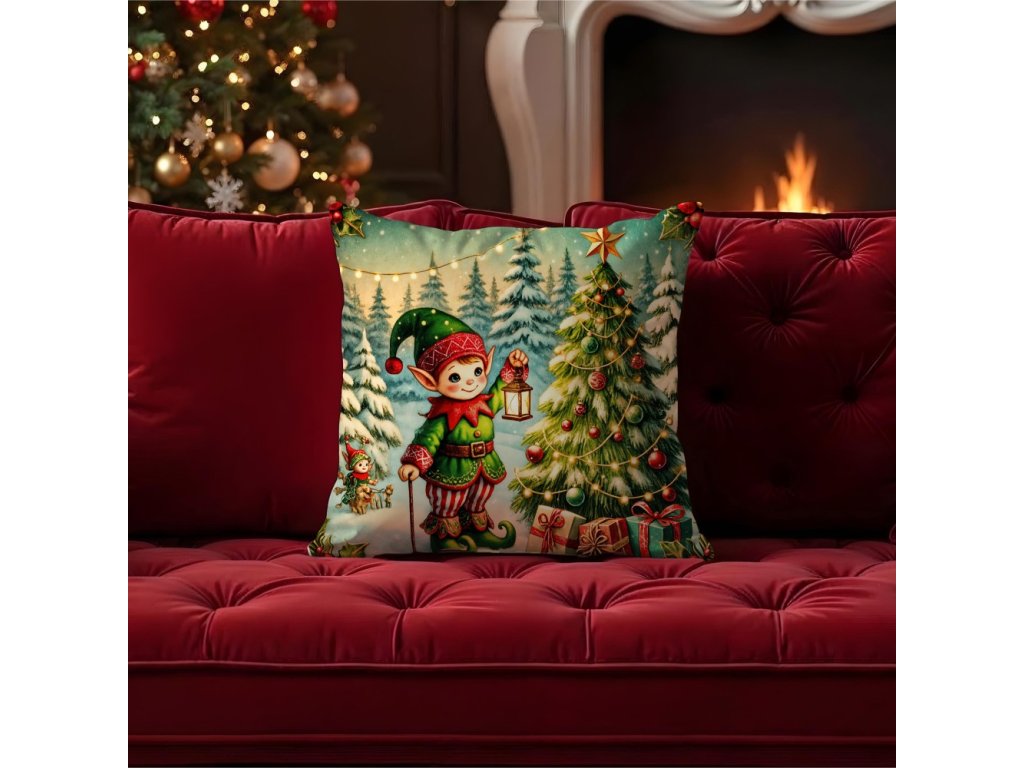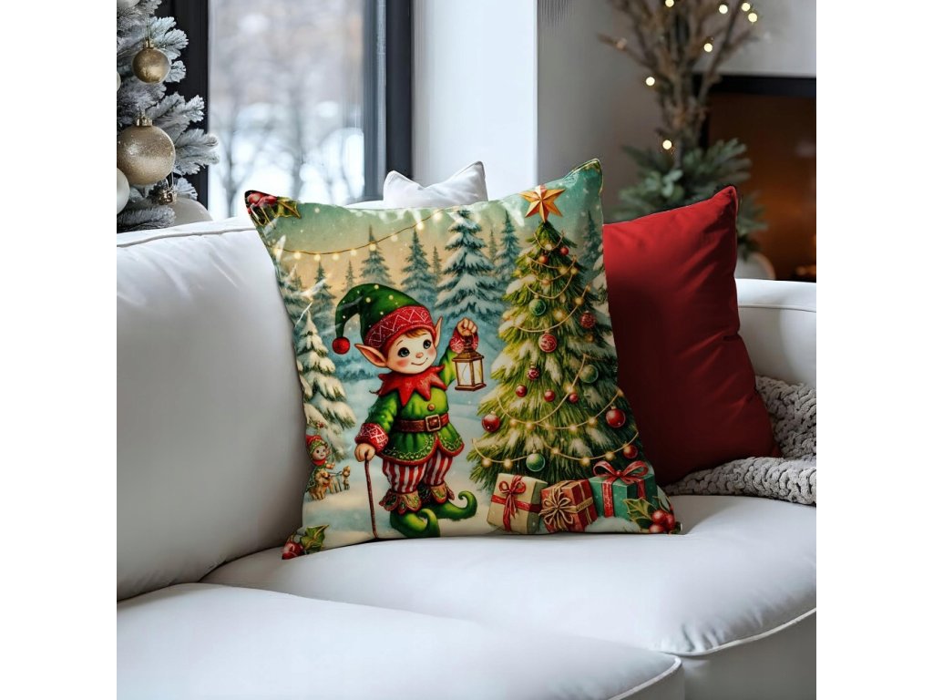 Vianočná obliečka Škriatok pri stromčeku je stvorená pre všetkých, ktorí milujú hravé, láskavé a svetielkami rozžiarené motívy. Usmievavý škriatok s lampášikom stojí pri bohato ozdobenom stromčeku, pod ktorým ležia darčeky – scéna ako z vianočnej rozprávky. Vďaka kombinácii zelených, červených a zlatých tónov pôsobí obliečka teplo a útulne.