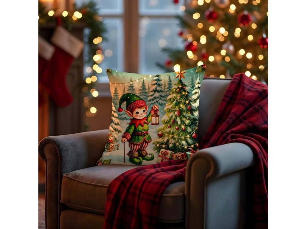 Vianočná obliečka Škriatok pri stromčeku – rozprávkový motív s darčekmi 40x40 cm