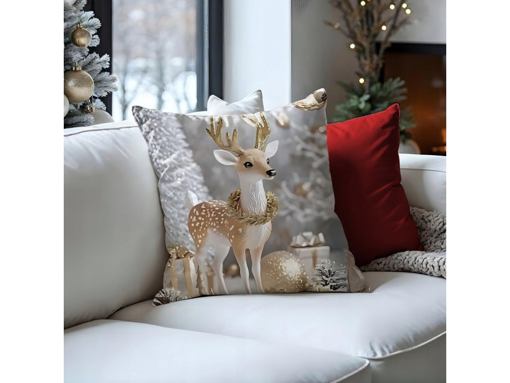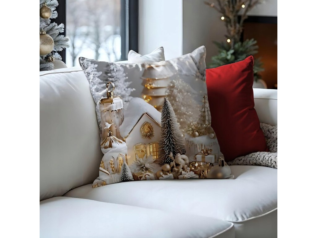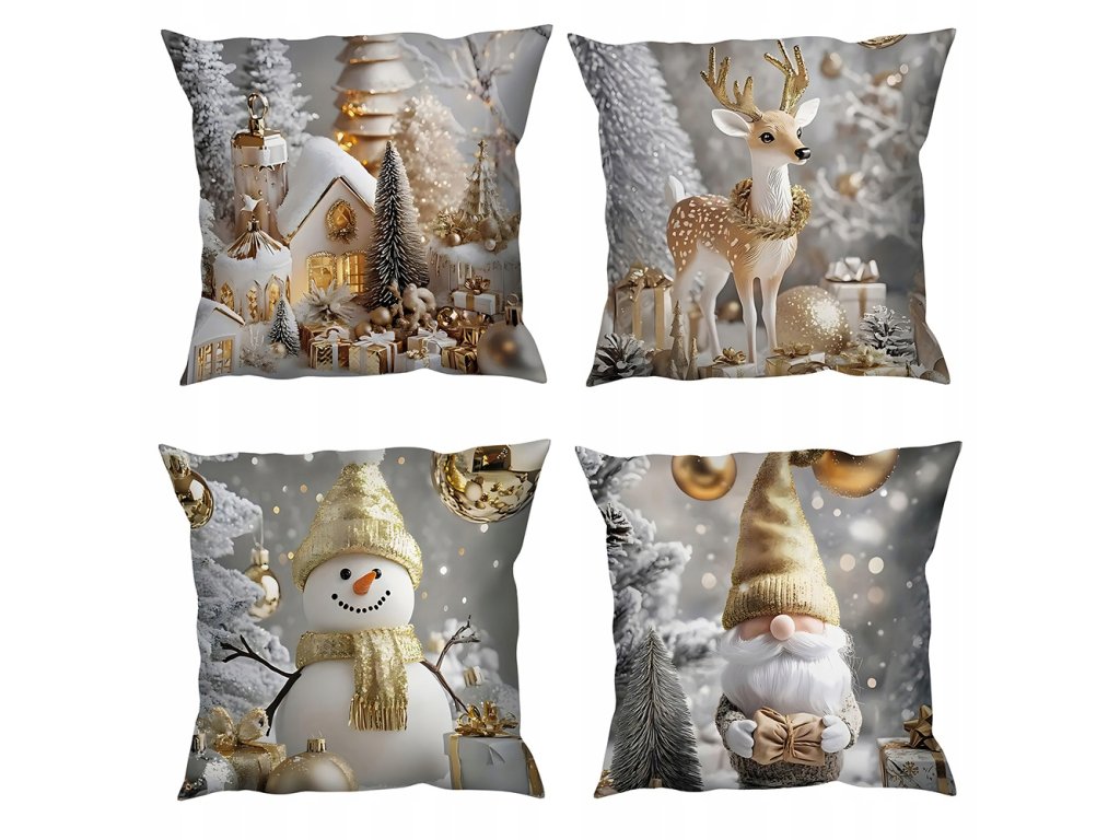 Táto sada 4 vianočných obliečok 40×40 cm v odtieňoch zlatej, bielej a šampanskej vnesie do vášho domova pocit luxusu a sviatočného pokoja. Motívy zlatej dedinky, soba, snehuliaka a škriatka vytvárajú elegantnú kombináciu tradície a moderného dizajnu, ktorá sa dokonale hodí do svetlých interiérov, spální i obývačiek.