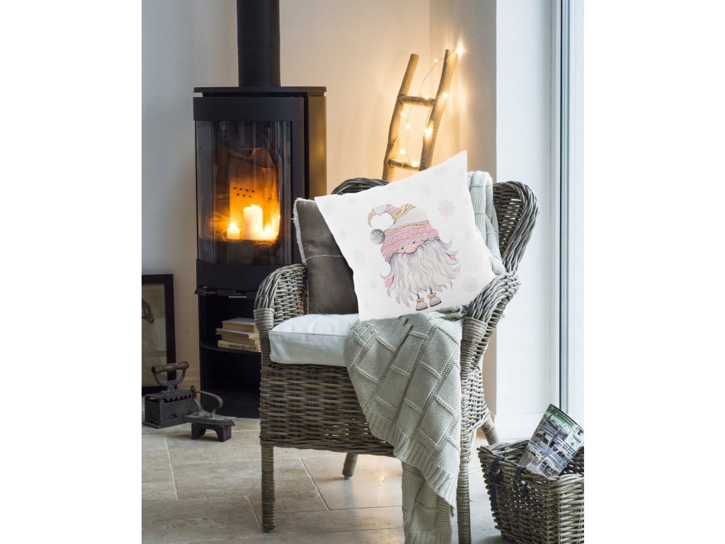 Vianočná zamatová obliečka Zimný škriatok – biely motív s ružovou čiapkou 40x40 cm