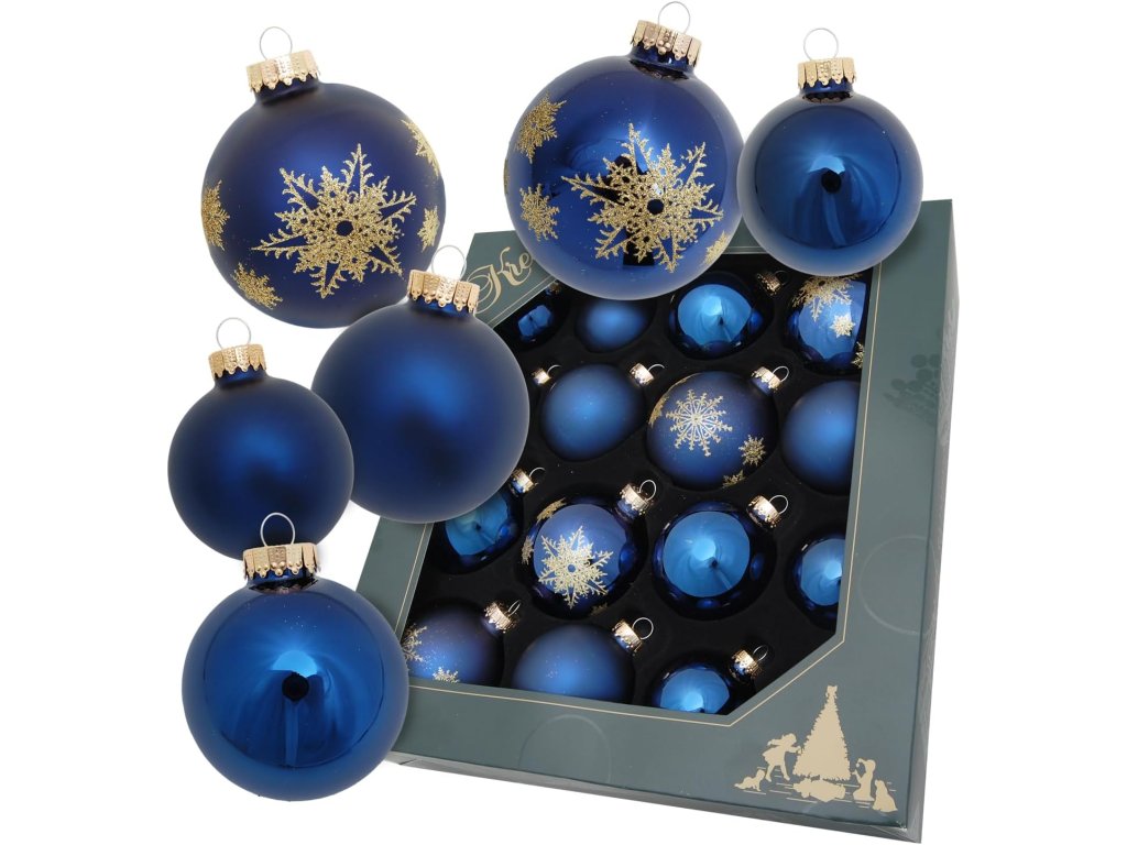 Ručne zdobené sklenené vianočné gule – modré so zlatými vločkami (16 ks, rôzne veľkosti)