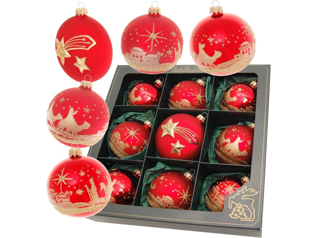 Ručne maľované sklenené vianočné gule s betlehemským motívom – červené a zlaté ozdoby v darčekovej sade (9 ks, Ø 8 cm)