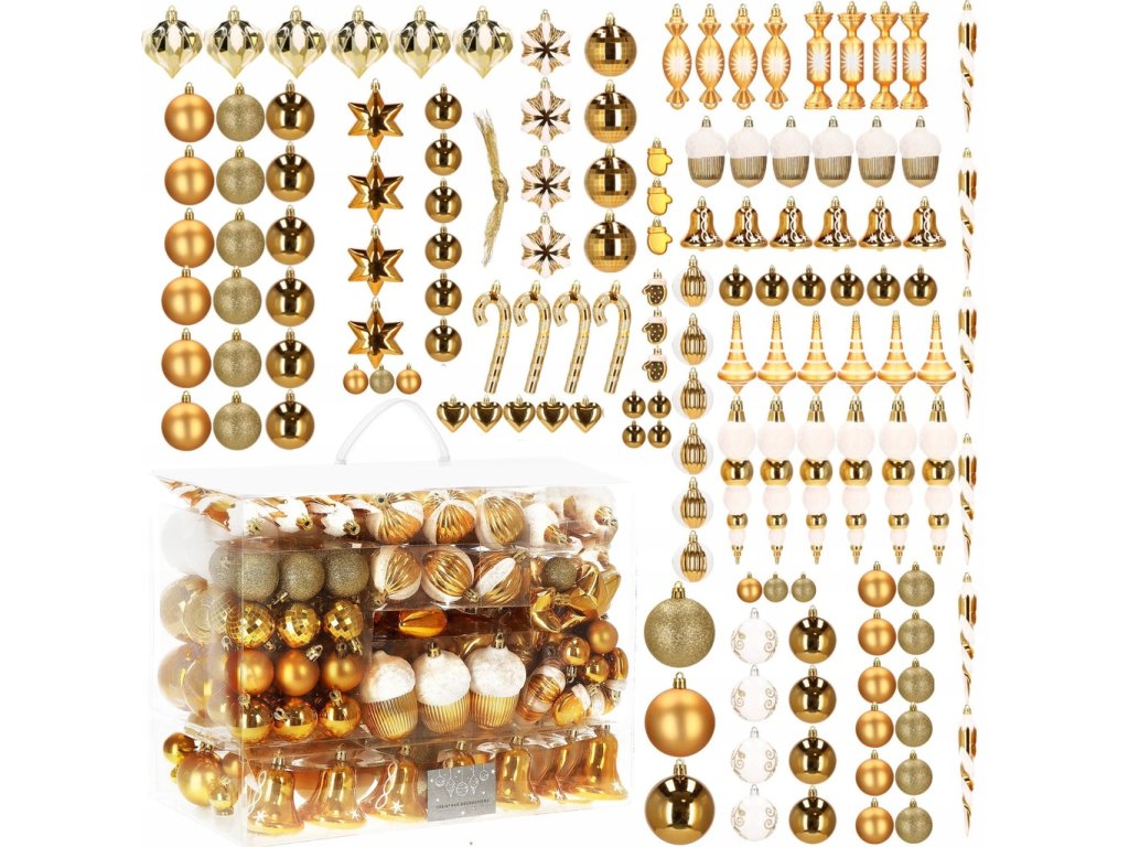 Veľká sada nerozbitných vianočných ozdôb v zlatej farbe – 149-dielny set gulí a dekorácií na stromček