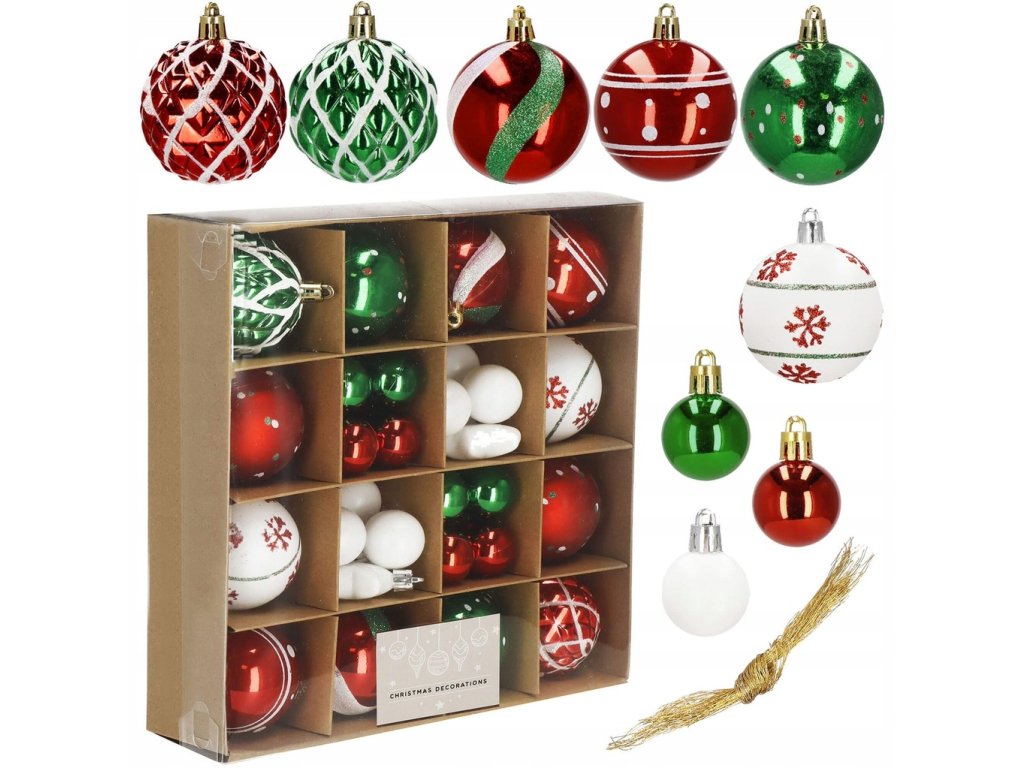 Sada nerozbitných vianočných ozdôb v červeno-zeleno-bielej farbe – 42-dielny set gulí a dekorácií na stromček