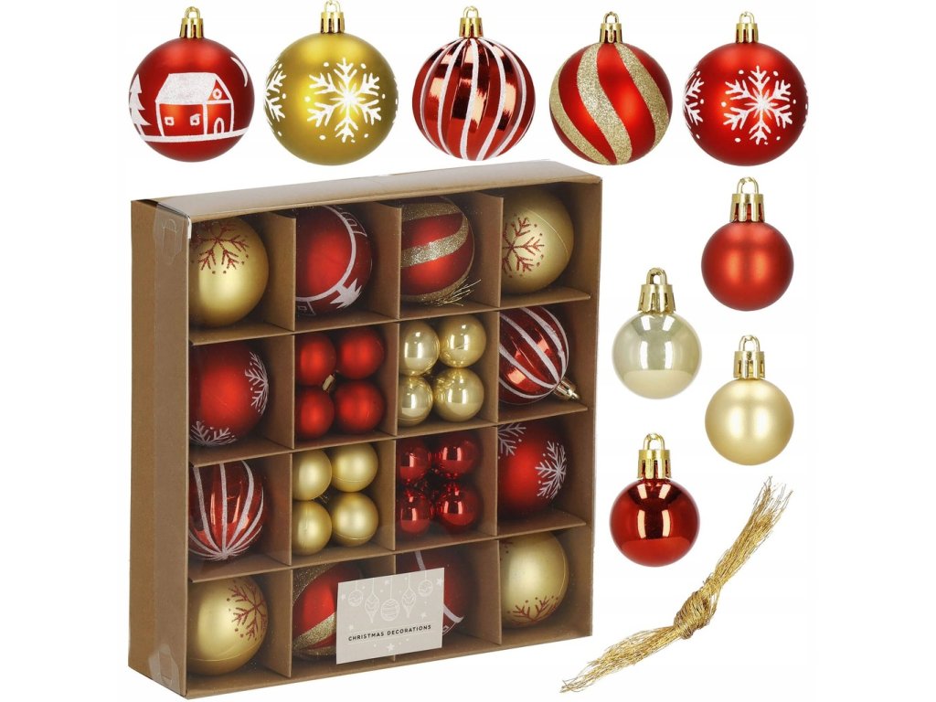 Sada nerozbitných červeno-zlatých vianočných gulí – 42-dielny set ozdôb na stromček (Ø 3–6 cm)