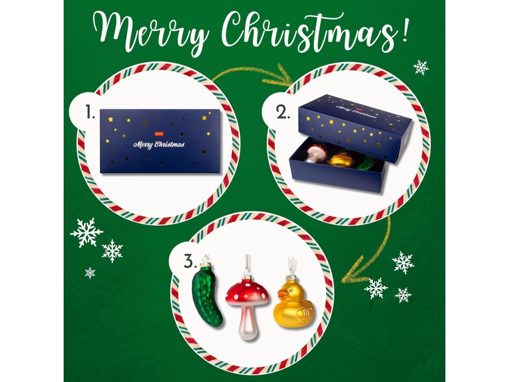 Táto darčeková sada sklenených vianočných ozdôb spája tradičné remeslo s moderným vianočným humorom. V elegantnej krabičke sa ukrývajú tri ručne maľované ozdoby – zelená uhorka, červený hríbik a zlatá kačička. Každá z nich má svoj jedinečný tvar aj symboliku, vďaka ktorej váš stromček získa nezameniteľný charakter.