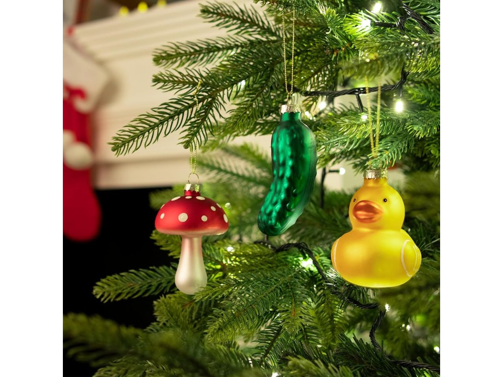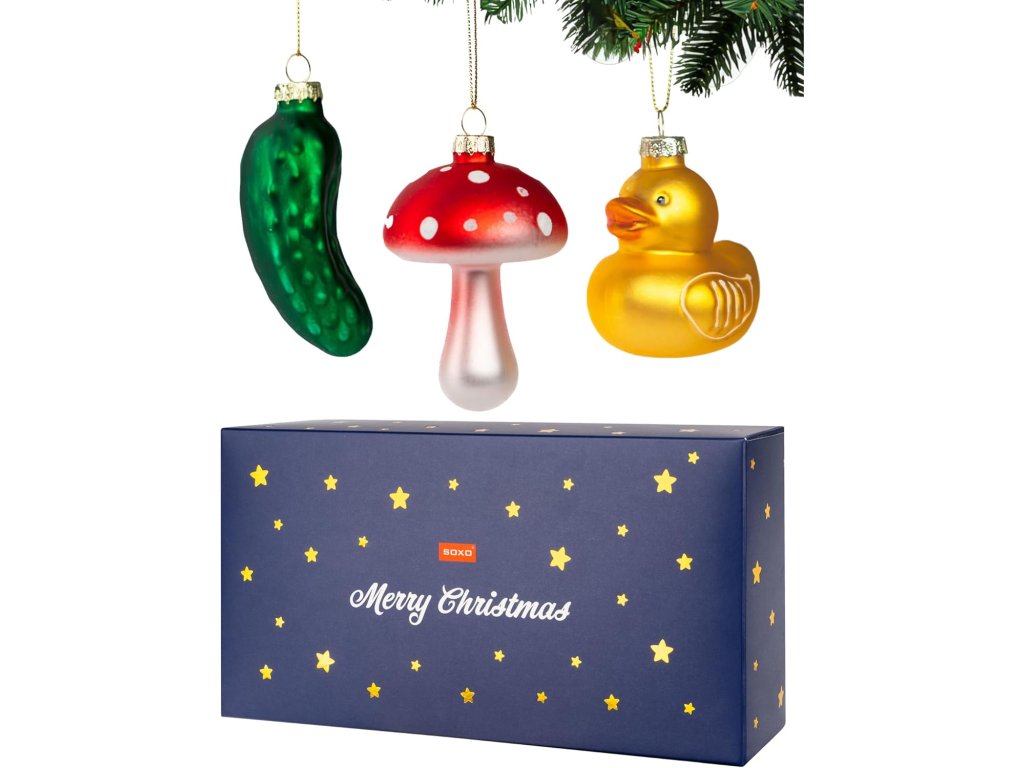 Originálna darčeková sada sklenených vianočných ozdôb – uhorka, hríbik a kačička (3 ks v krabičke)