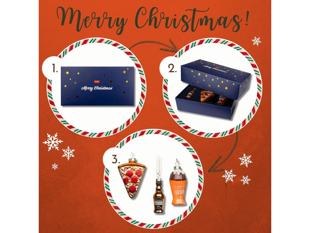 Táto darčeková sada sklenených vianočných ozdôb prináša svieži nápad do klasických sviatočných dekorácií. V elegantnej krabičke sa ukrývajú tri ručne maľované ozdoby – plátok pizze, fľaša whisky a pohár piva. Ich realistický vzhľad a precízne detaily zaručene upútajú pozornosť a vyčaria úsmev na každom vianočnom stromčeku.
